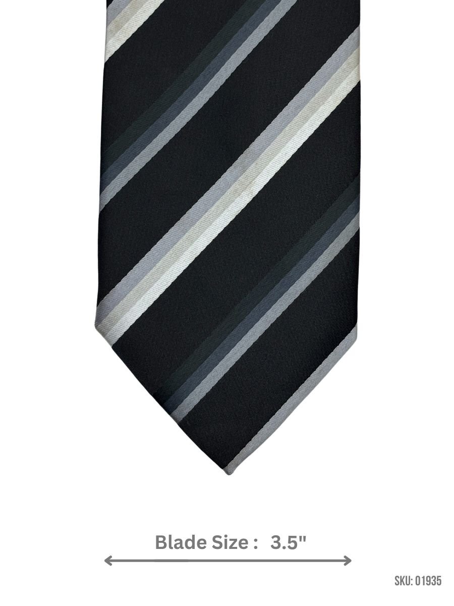 Add sophistication to your look with this classic black tie featuring elegant grey stripes. The 3.5-inch blade offers a timeless and versatile fit
