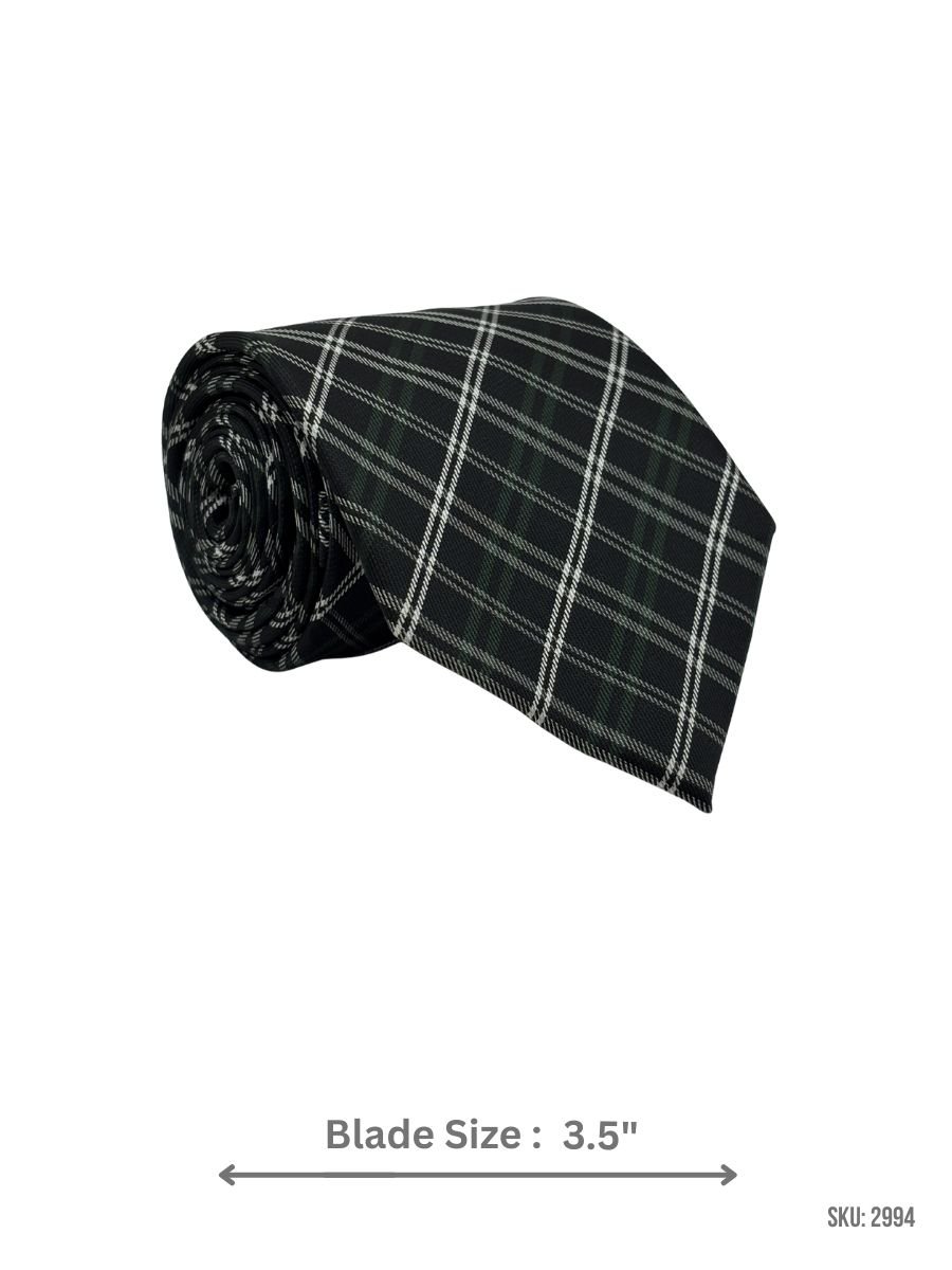 A dark green and black plaid tie with crisp white line accents for a sharp, classic finish.