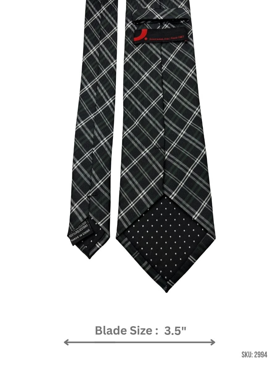 This dark green and black tie features a structured plaid pattern highlighted by clean white lines for contrast and definition. A great option for business wear, fall/winter styling, and formal gatherings, it pairs smoothly with white, cream, or light grey shirts and darker suits.