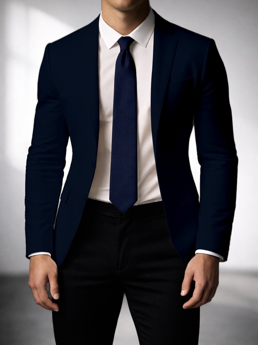 A sleek dark navy tie featuring a solid textured weave for a clean, timeless look. Ideal for office wear, weddings, and formal occasions.