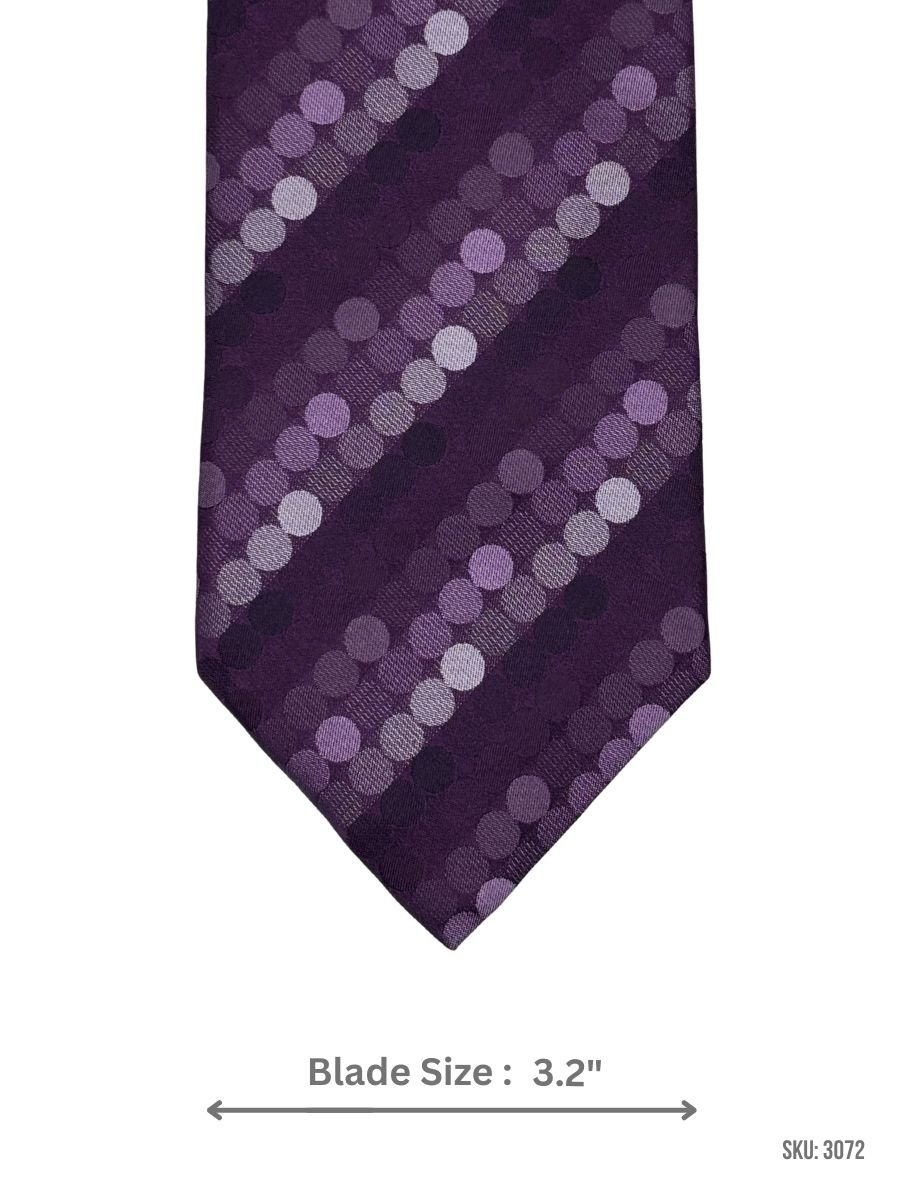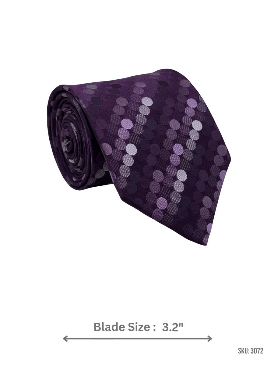 This deep purple tie is designed with diagonal bands made from lavender and grey dot motifs, creating dimension and movement without looking busy. Perfect for weddings, dinners, and statement formal looks, it pairs well with solid shirts and suits in charcoal, navy, or black.