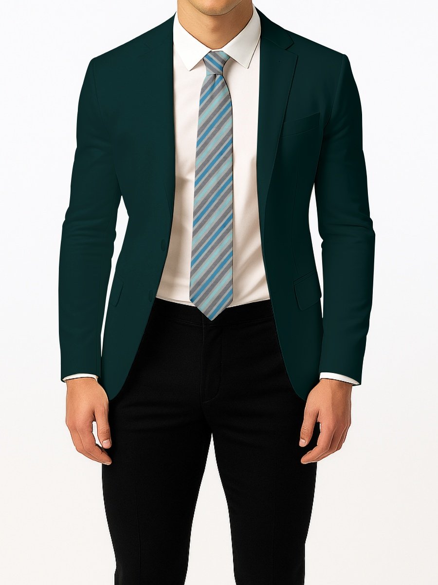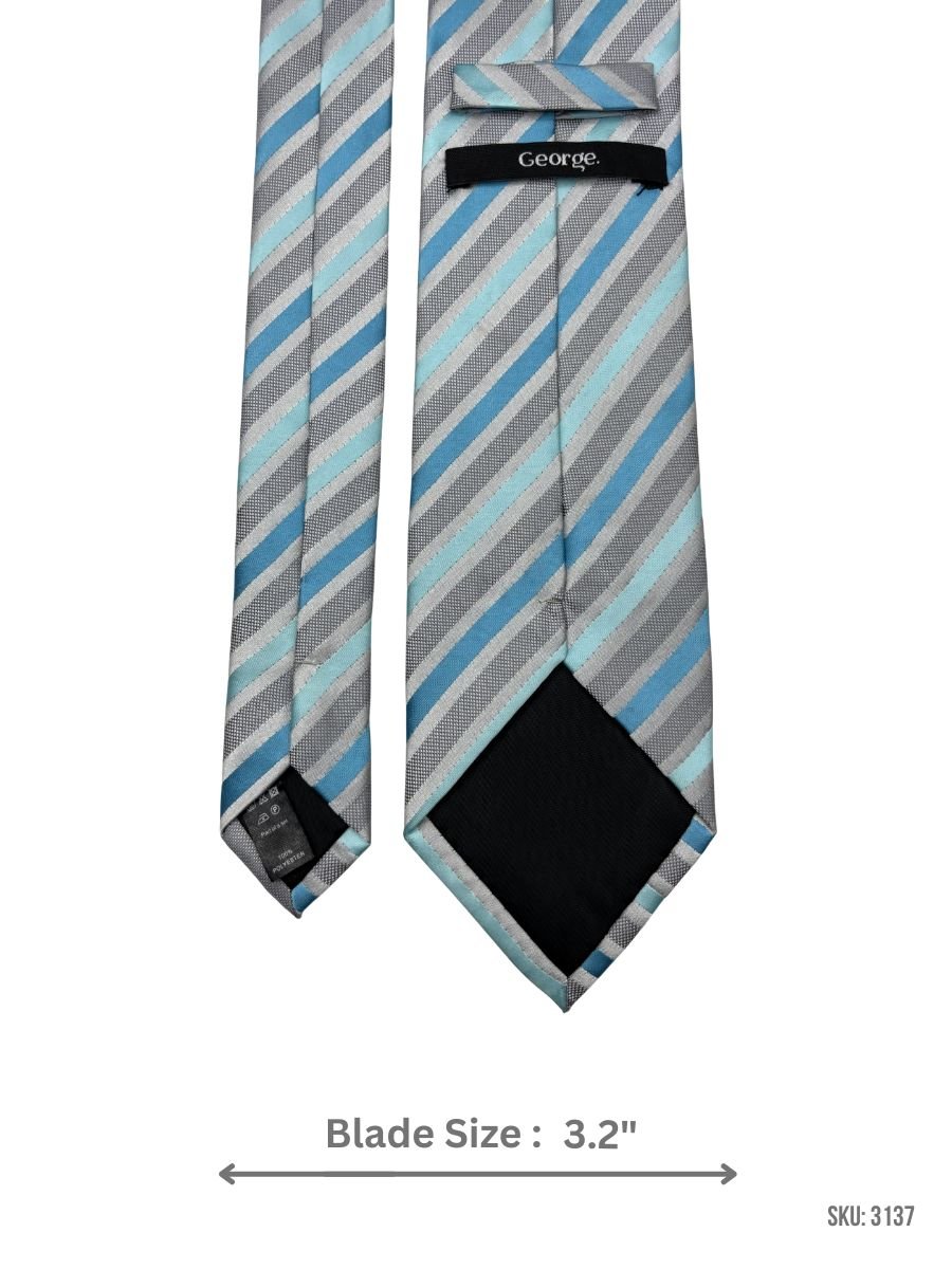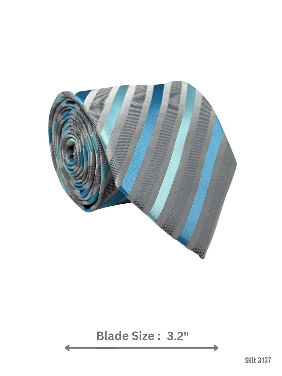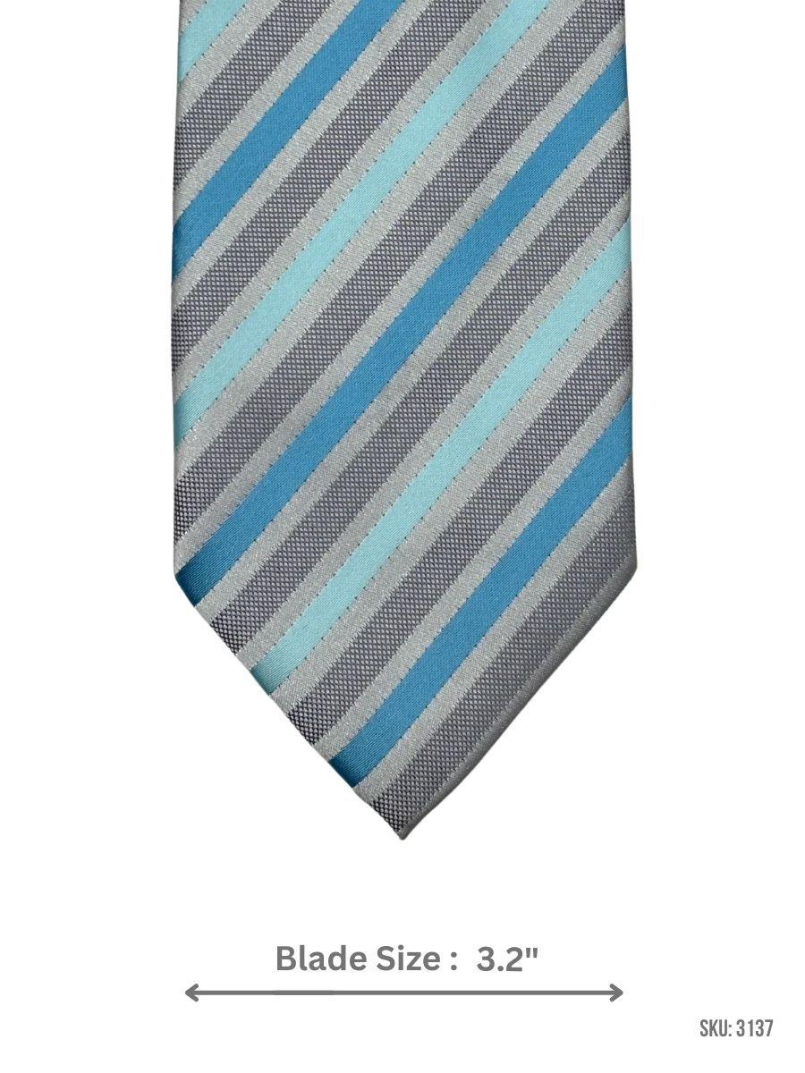 This gray tie combines cool-toned diagonal striping in aqua blue, sky blue, and silver gray for a clean, contemporary style. Great for business attire, meetings, and semi-formal events.