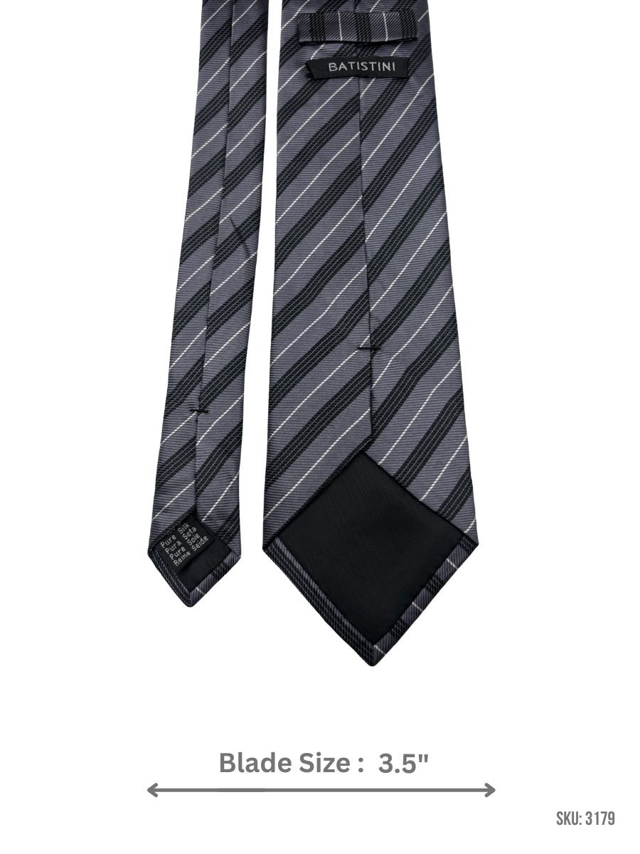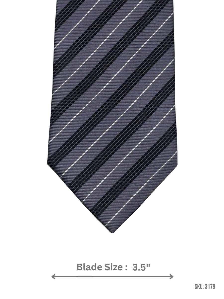 This gray tie features strong black diagonal stripes balanced with thin white striping for a polished, business-ready look. Great for workwear, presentations, and formal events.