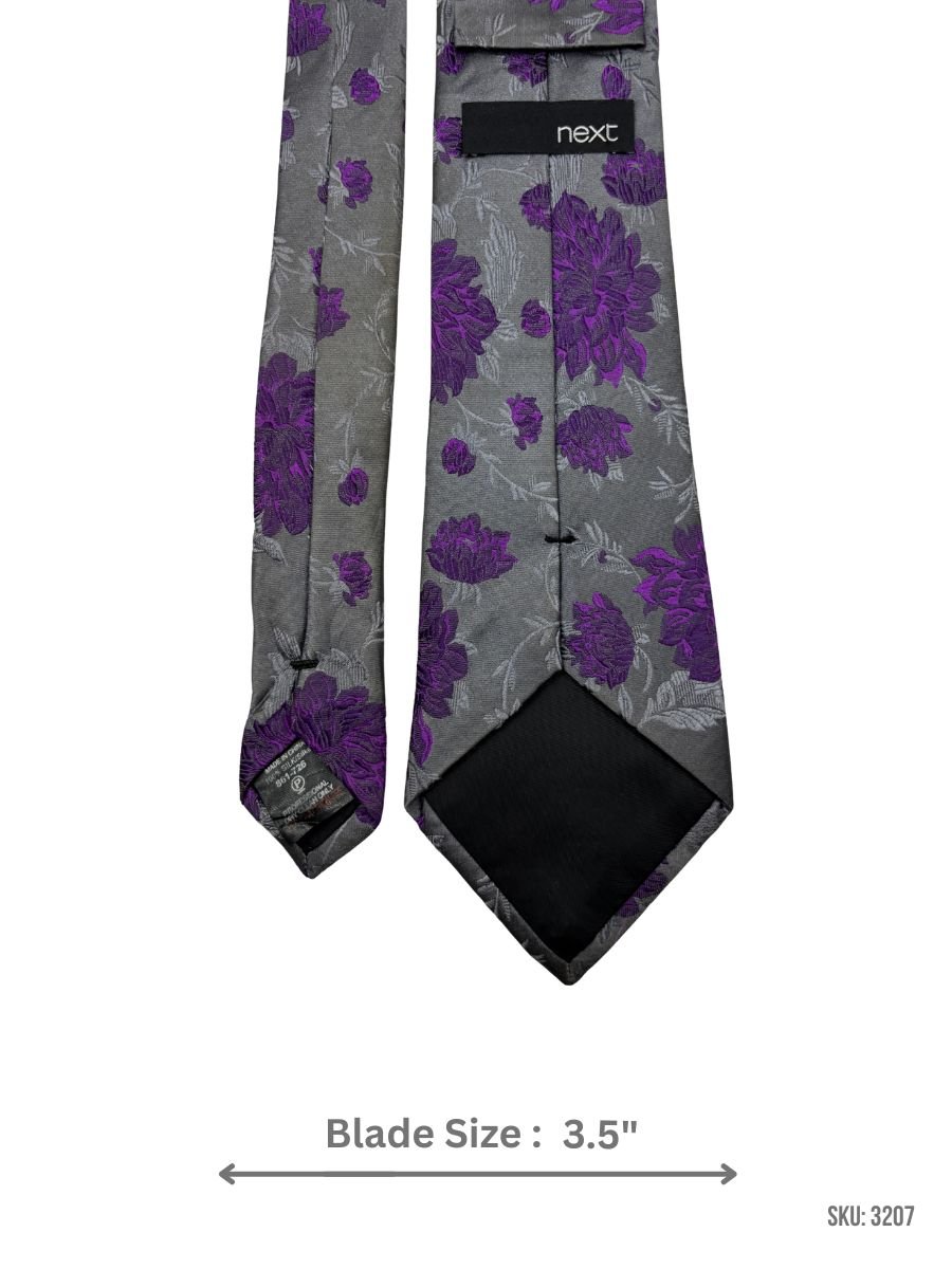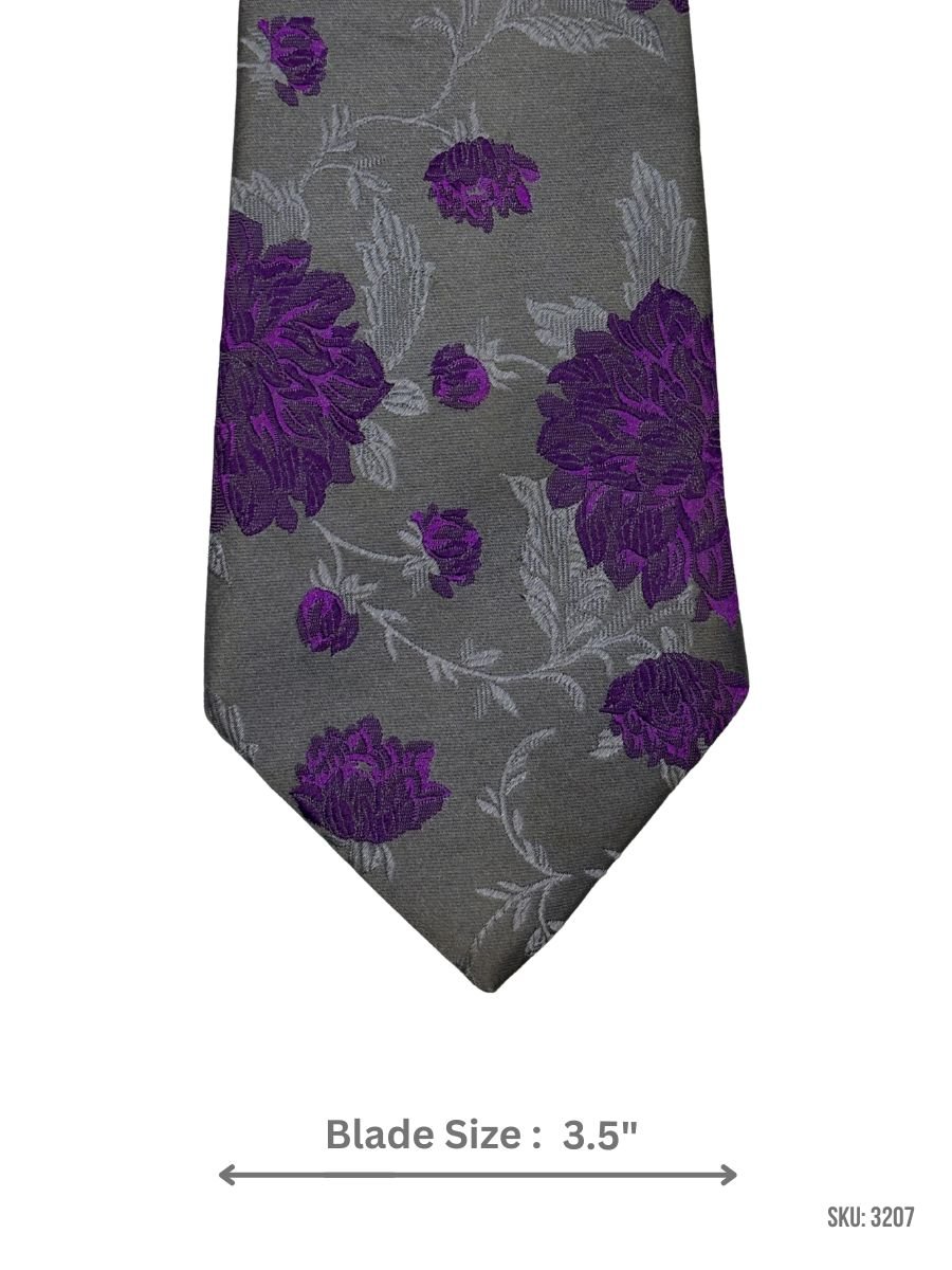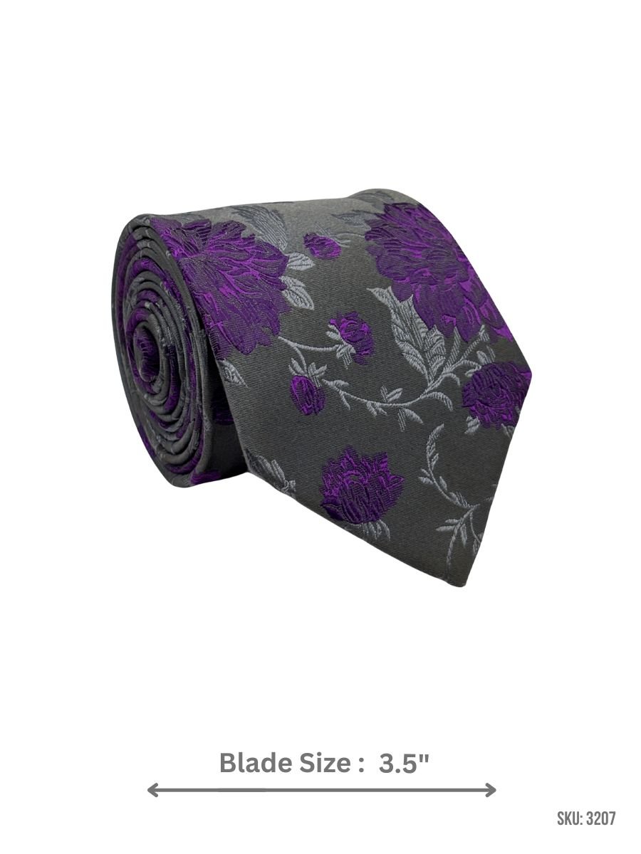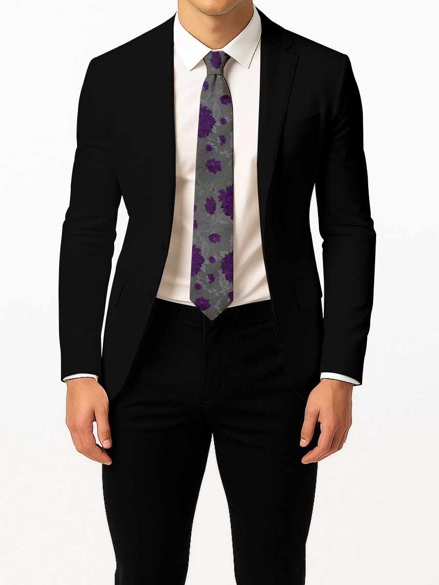 This gray tie features a bold purple floral jacquard layered with light gray vine accents for a premium, dressy feel. Ideal for weddings, evening wear, and standout formal styling.