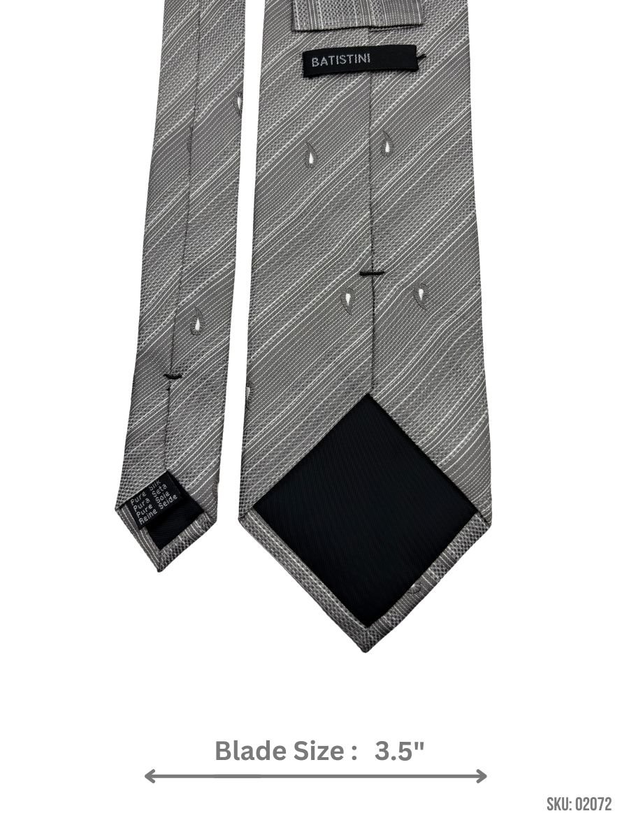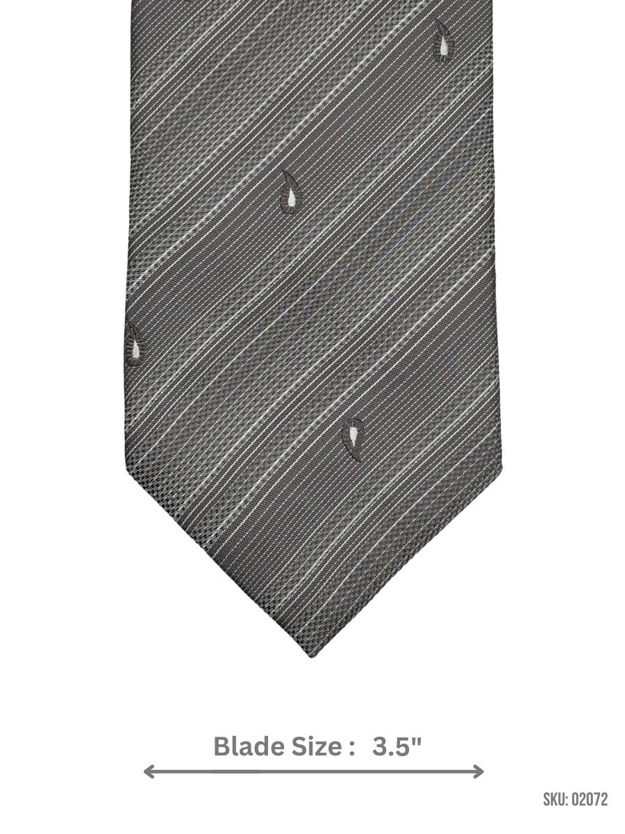 Elegant gray tie with silver diagonal stripes and a subtle teardrop pattern. Classic 3.5″ width for a timeless look.