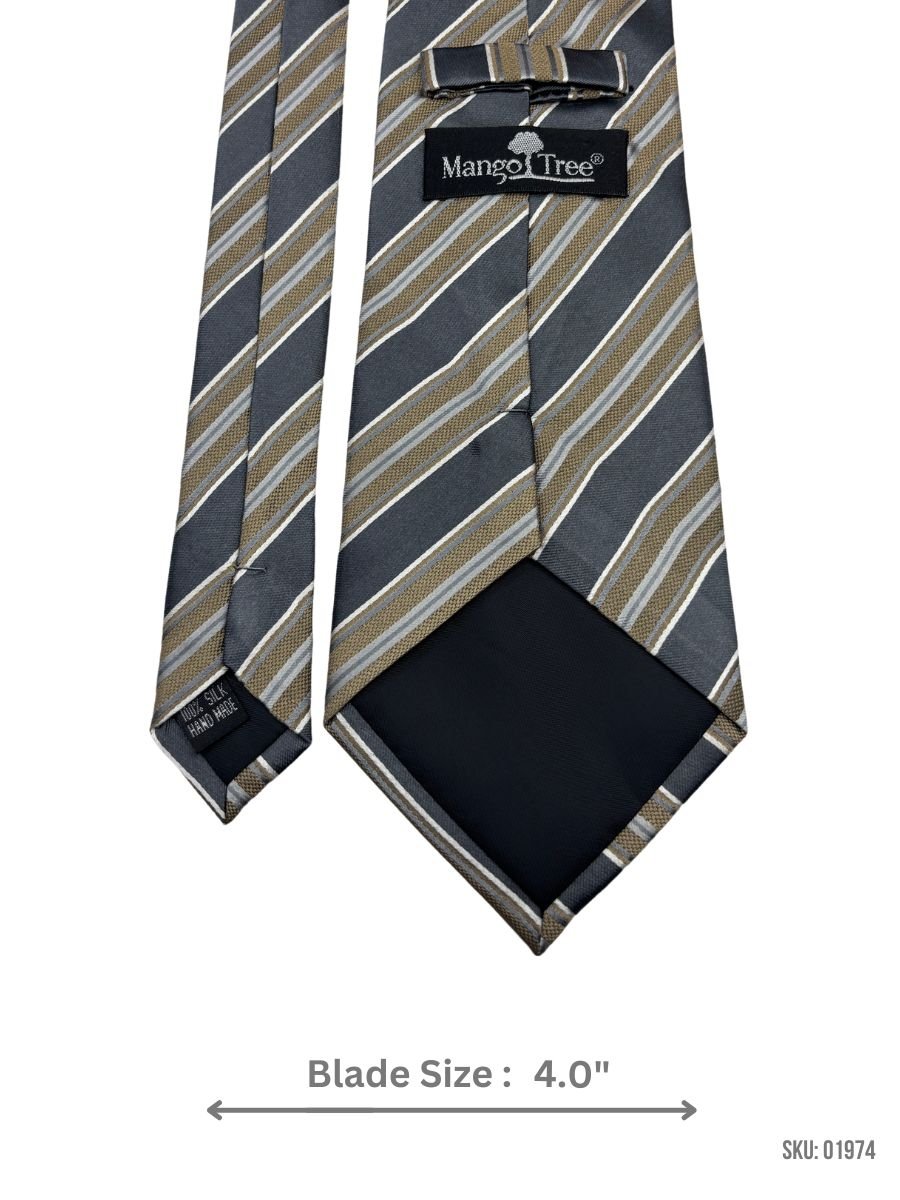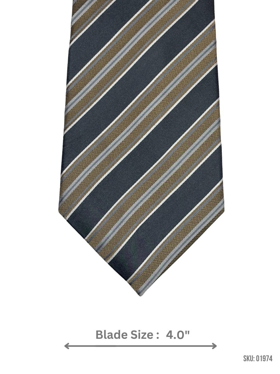 This green tie with bold gold and grey stripes brings timeless elegance to your outfit. The wide 4.0-inch blade ensures a traditional fit, making it ideal for weddings, formal events, or professional settings. Designed with premium materials, this tie provides comfort, durability, and a refined finish.