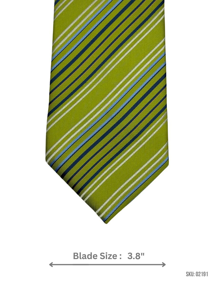This green tie with vibrant multicolor stripes is perfect for adding a pop of color to your formal wardrobe. The varying widths of the stripes create a dynamic, modern look, and the 3.8″ blade size provides a sharp and polished finish to your attire.