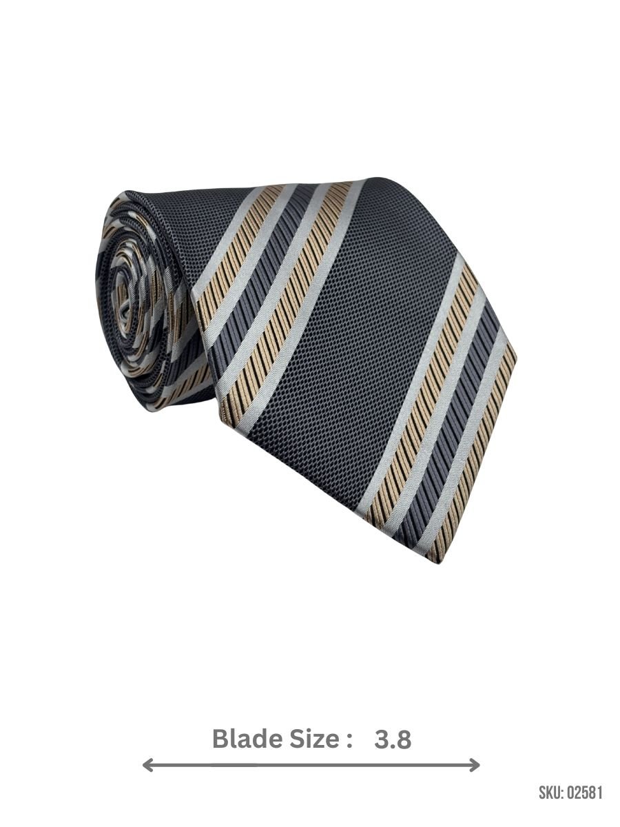 A sleek grey tie with alternating gold and silver stripes for a sophisticated look.