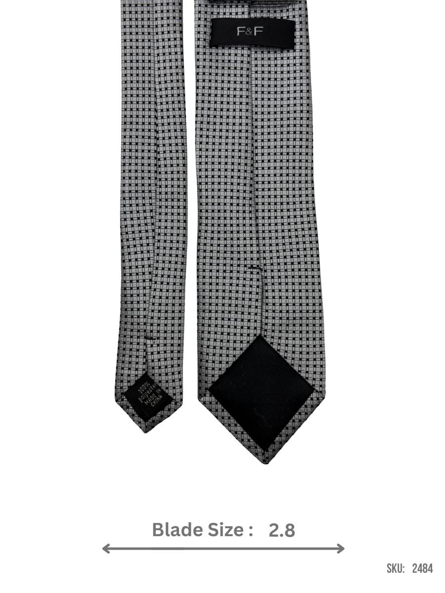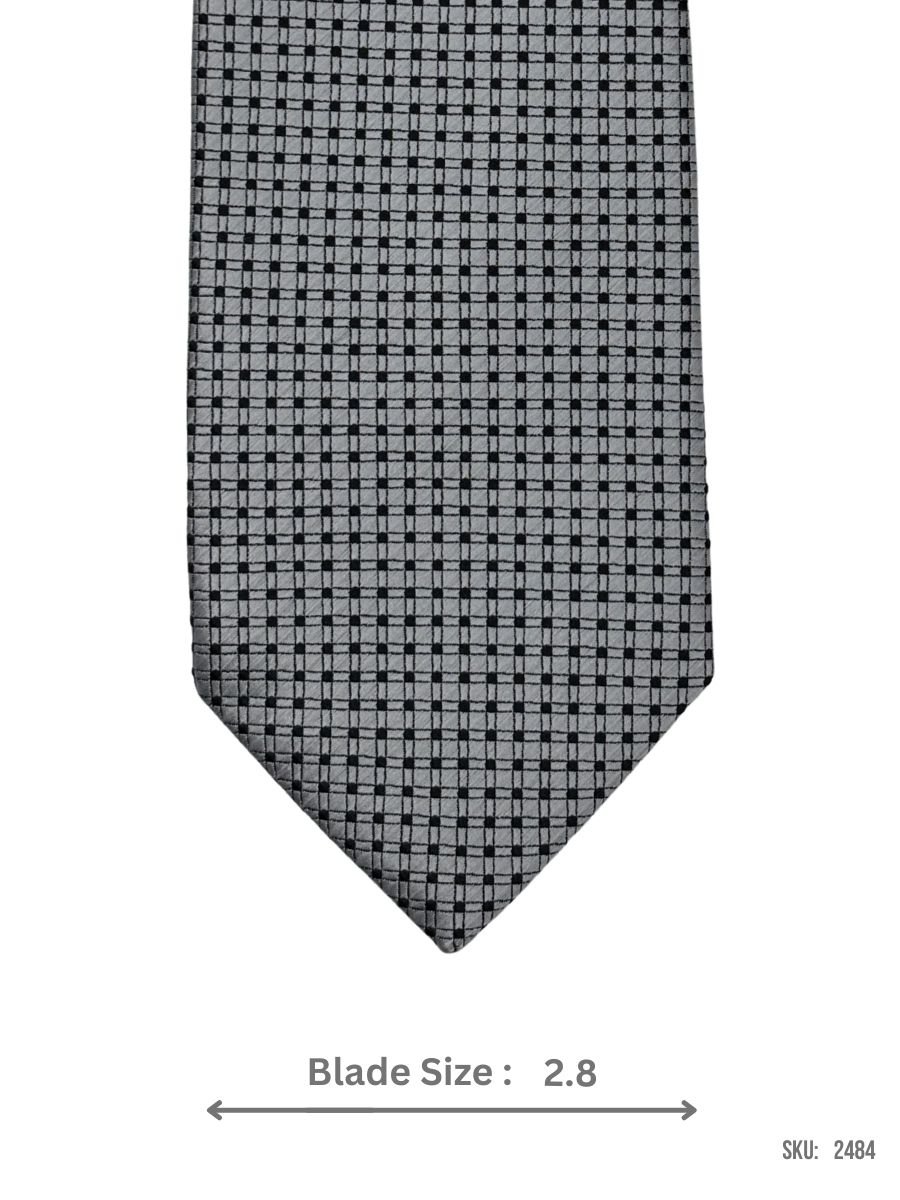 This grey tie with a black grid pattern provides a clean, geometric look. Its versatile color and pattern make it an excellent choice for both business meetings and casual formal events, enhancing any attire with a contemporary touch.