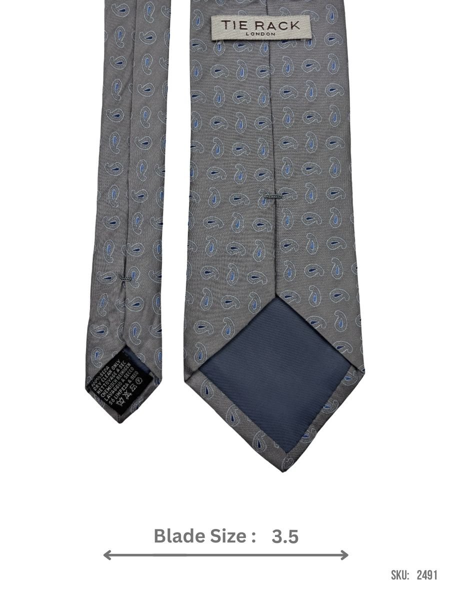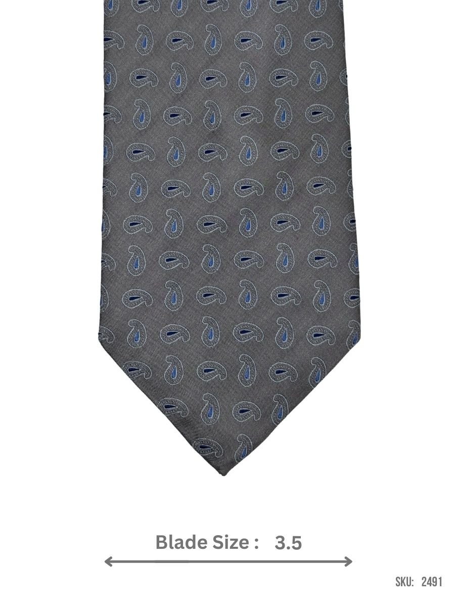 A sleek grey tie featuring an intricate paisley design in blue and silver tones. Ideal for adding flair to formal and semi-formal outfits.