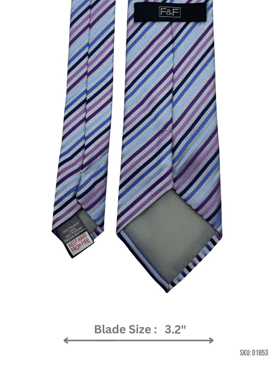 This striped tie combines lavender, blue, and silver tones in a striking diagonal pattern on a 3.2-inch blade. A stylish choice for any formal setting.
