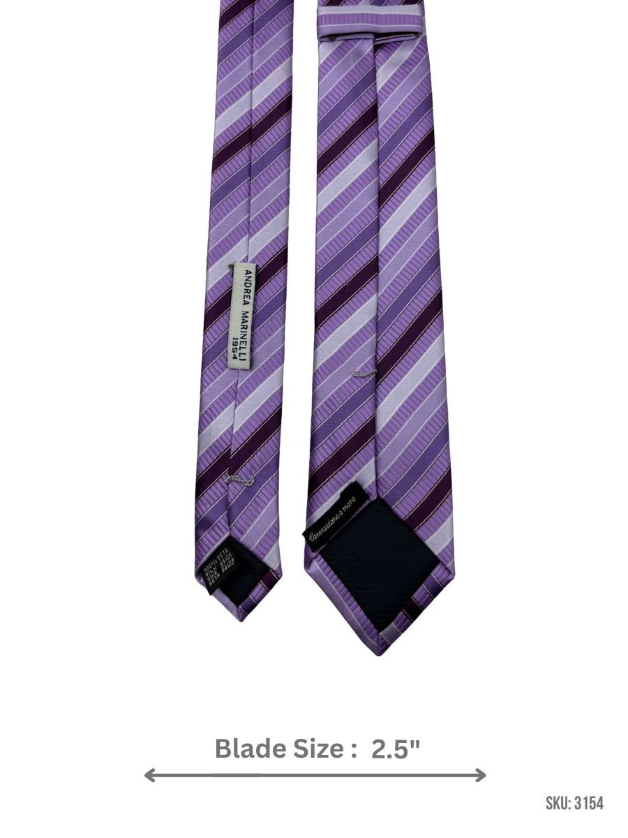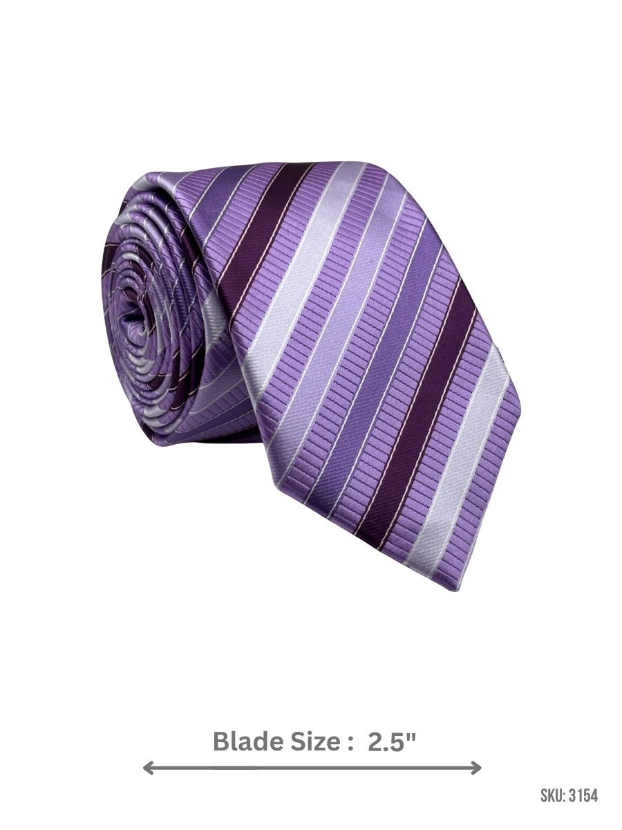 This lavender tie blends multiple diagonal stripe tones—white, light lavender, and dark purple—for a modern statement that still feels refined. Ideal for weddings, evening events, and standout office styling with solid shirts and tailored suits.