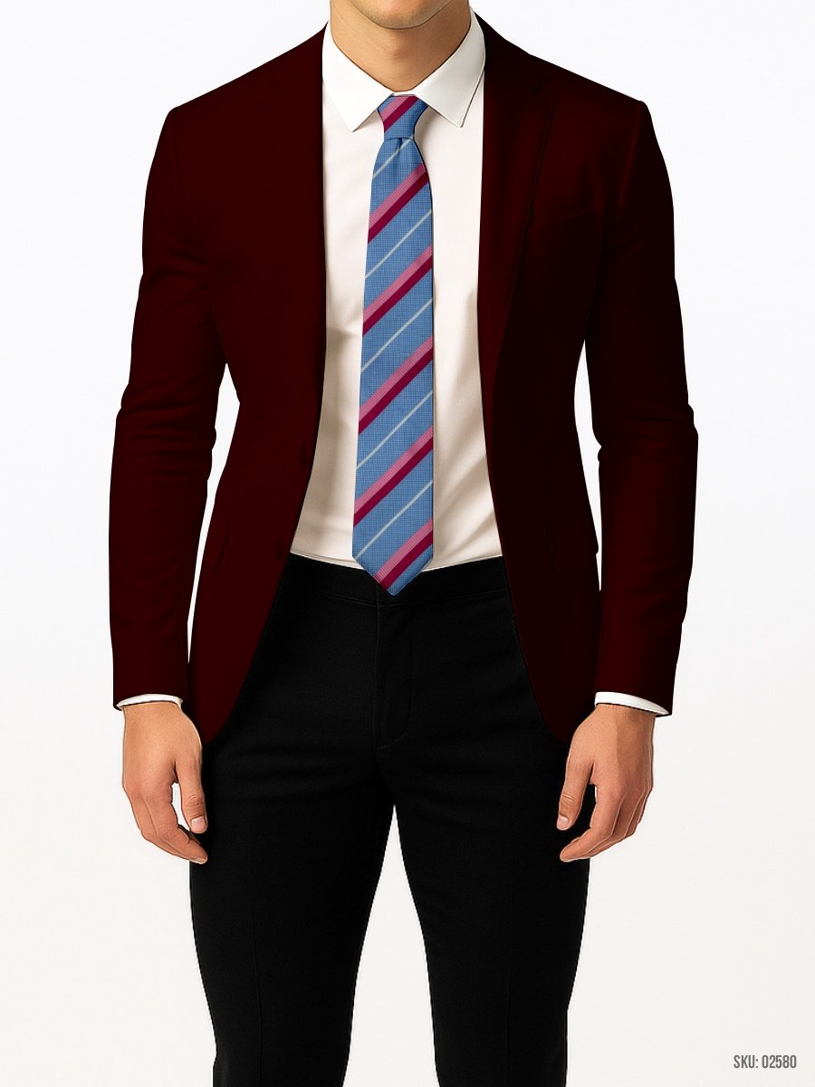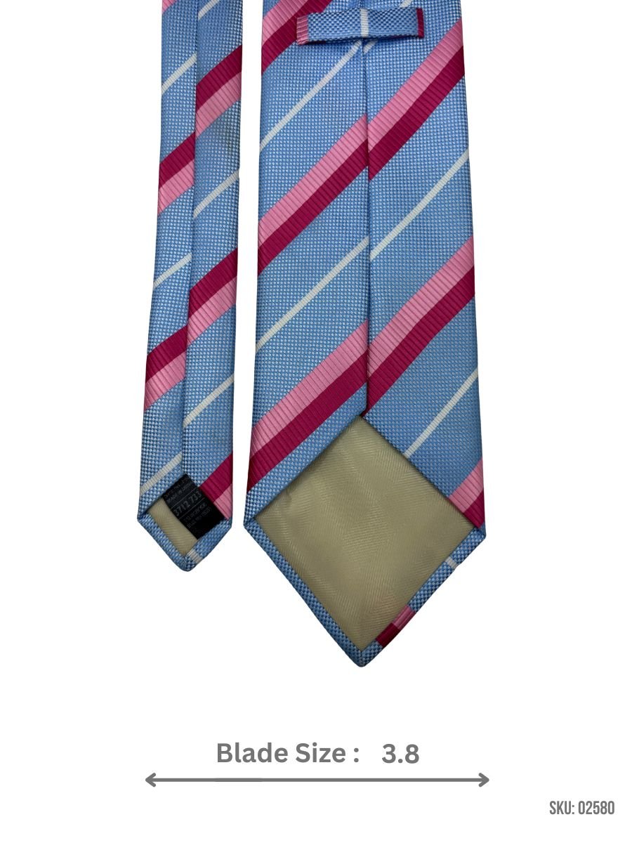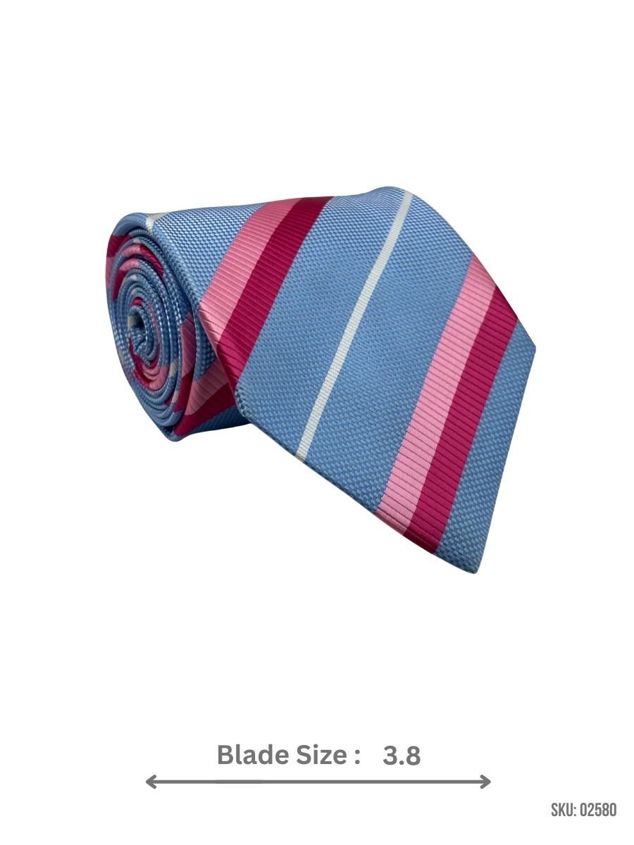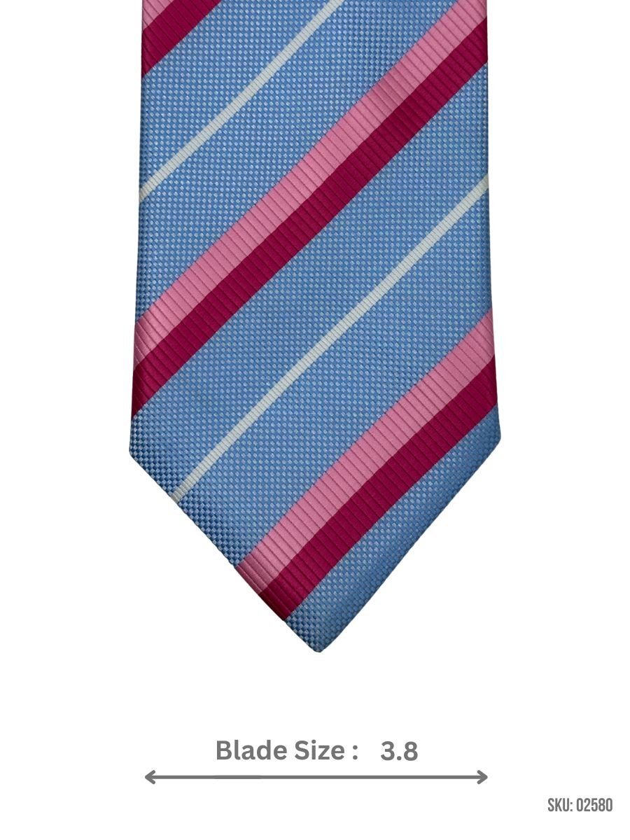 This light blue tie with pink and white stripes brings a vibrant yet refined look to both formal and casual settings. Perfect for weddings or business events, it pairs well with various shirts and suits for a polished appearance.