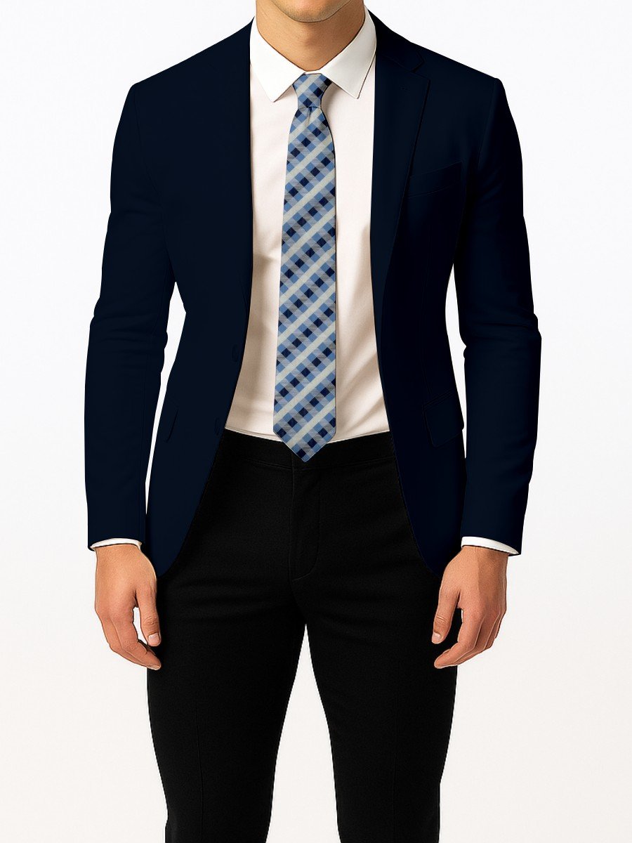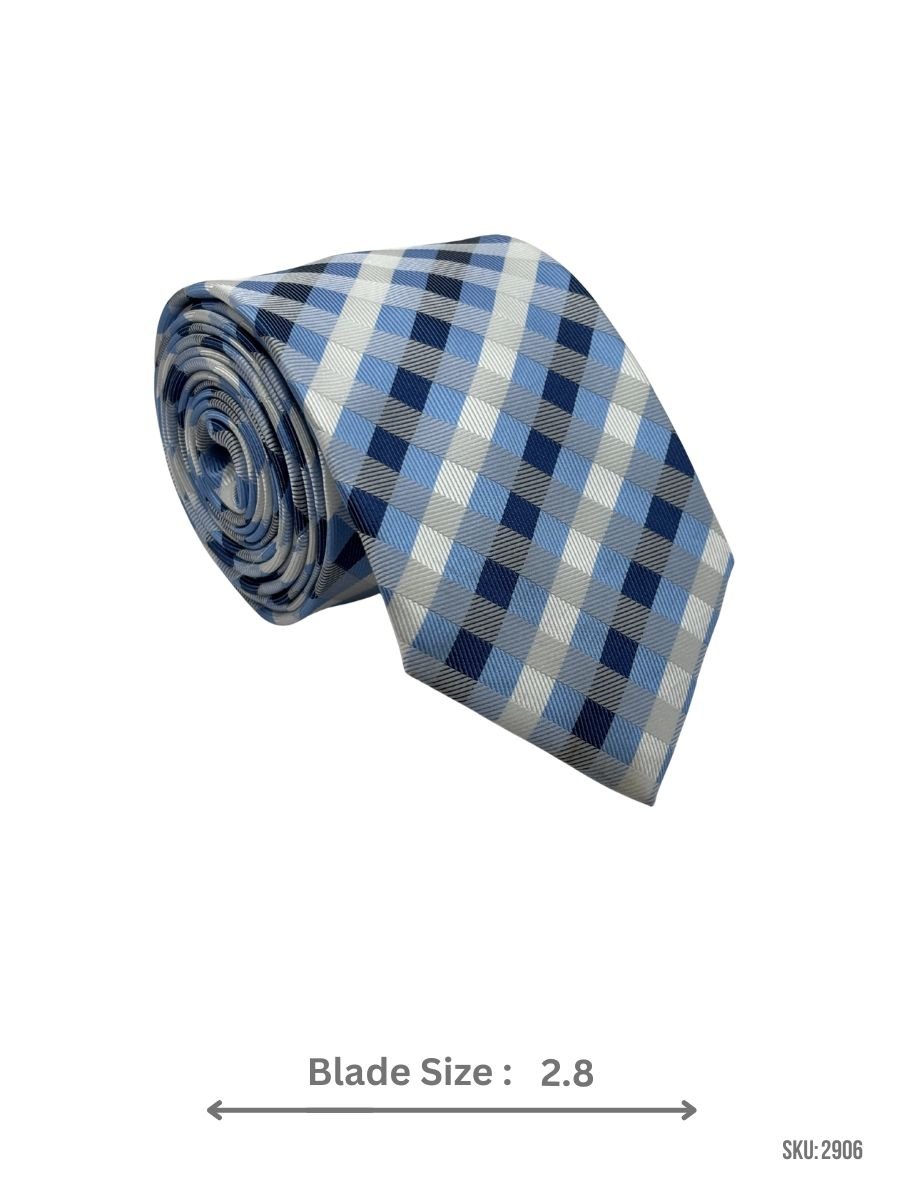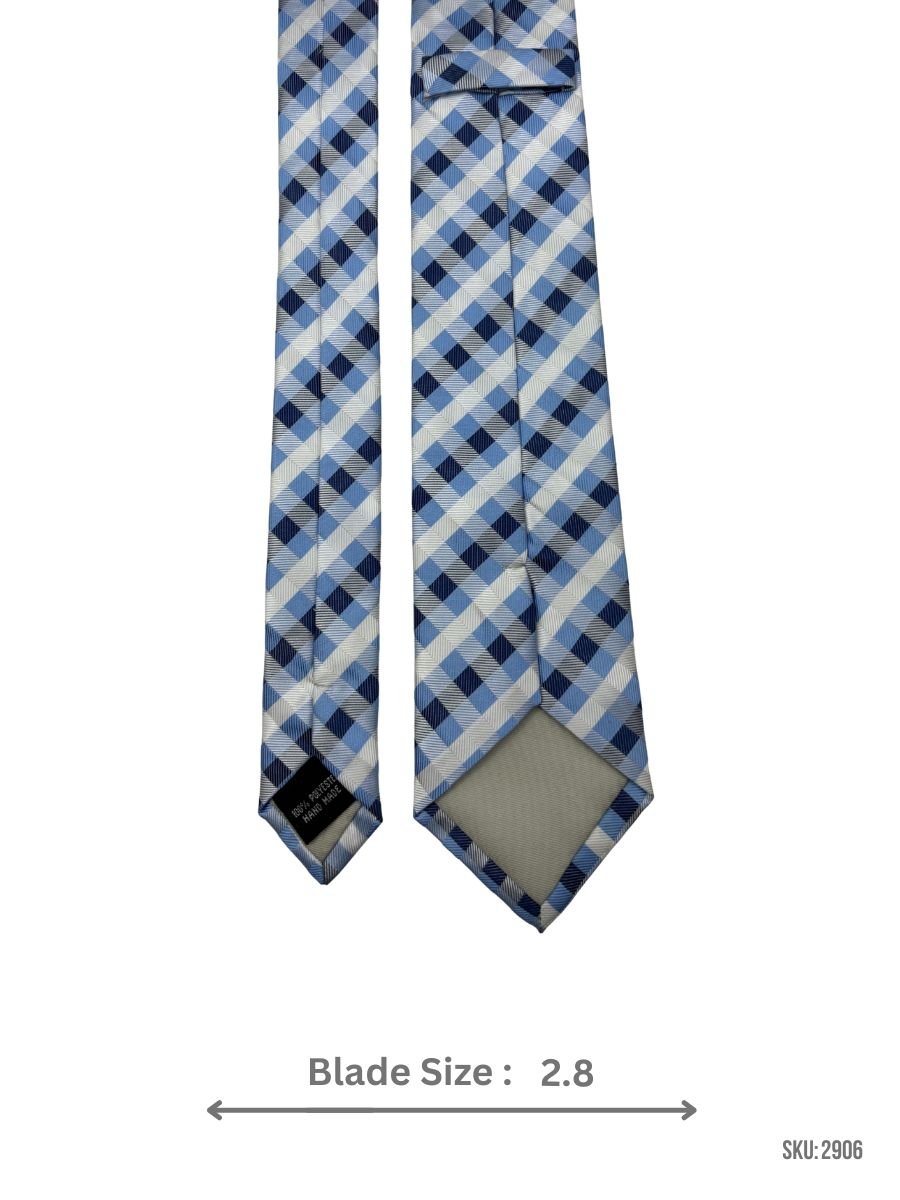 This check‑pattern tie blends light blue, navy, and white tones in a structured grid for a crisp and modern finish.