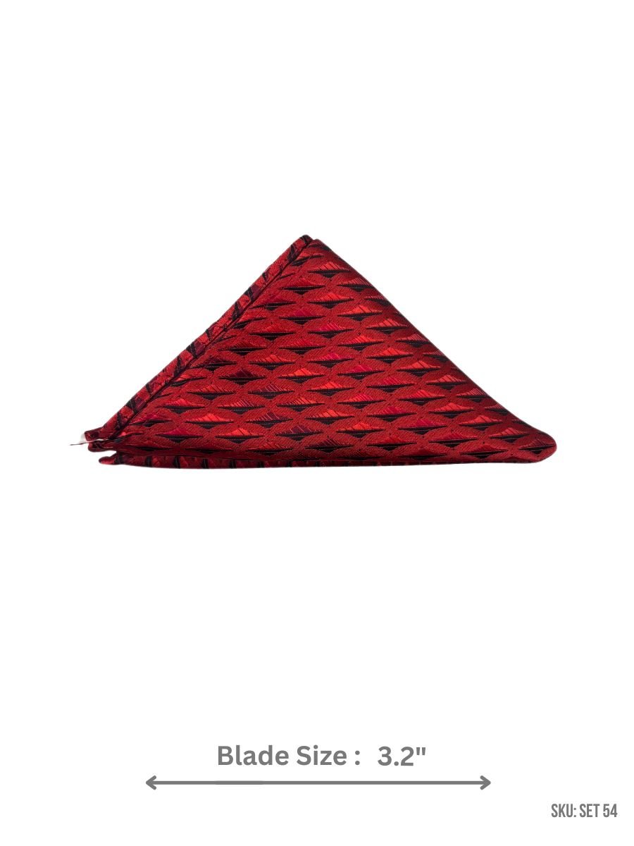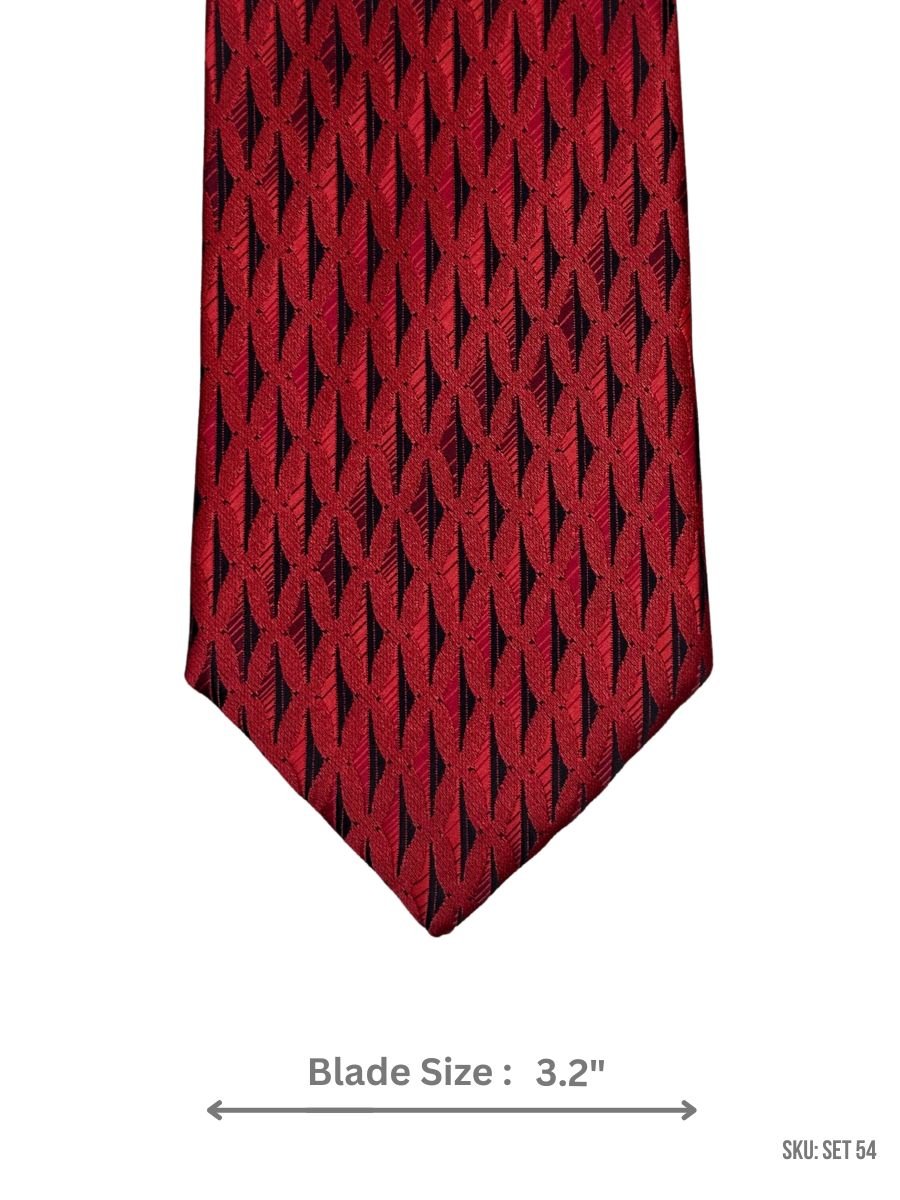 Refine your formal look with this men’s classic maroon and black woven tie set, designed to offer a bold and stylish edge to any suit. The rich maroon base is accentuated by sleek black and red geometric detailing, making it an eye-catching yet tasteful accessory. Made from premium woven fabric, it ensures durability and comfort, while the 3.2-inch blade width delivers a balanced silhouette suitable for both traditional and modern outfits. Ideal for office wear, formal dinners, weddings, or festive events, this tie set also includes a perfectly coordinated pocket square to complete your polished look.