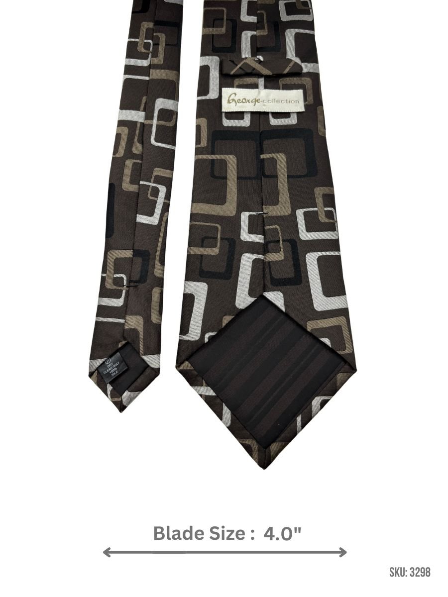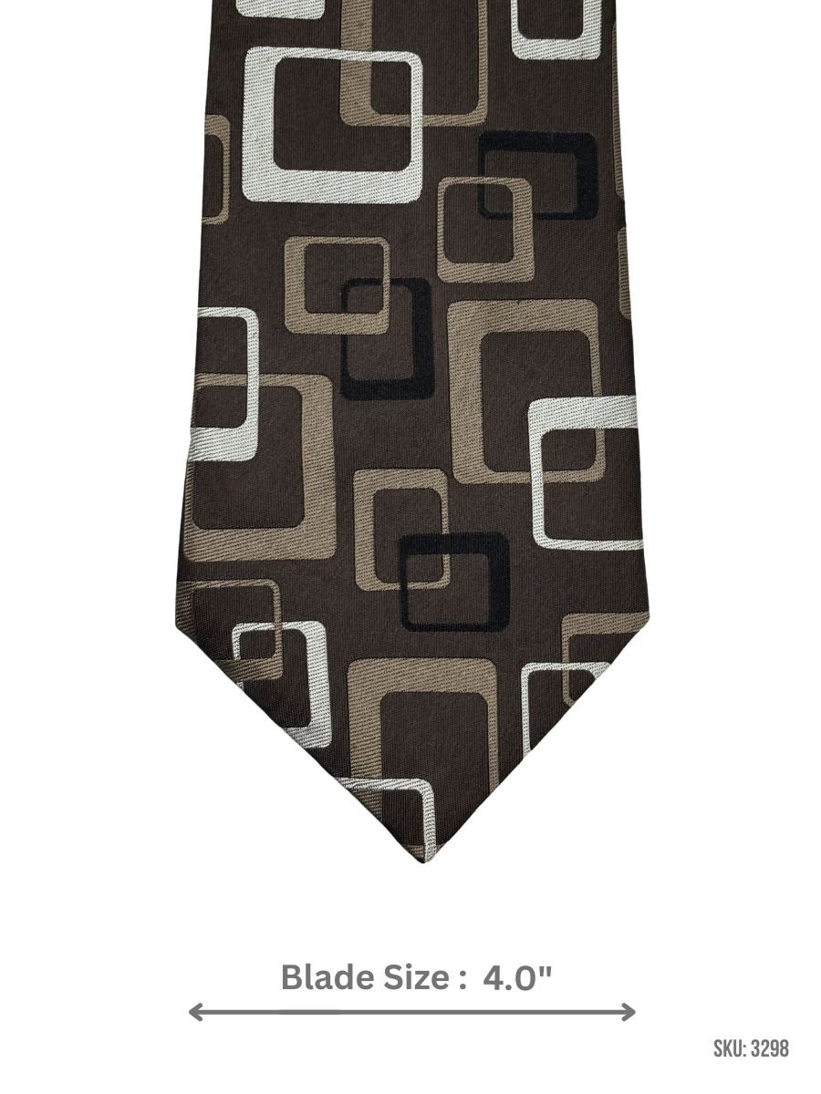 A distinctive mocha brown tie featuring beige, cream, and black overlapping squares for a bold retro-inspired look. Great for office wear, parties, and statement formal styling.
