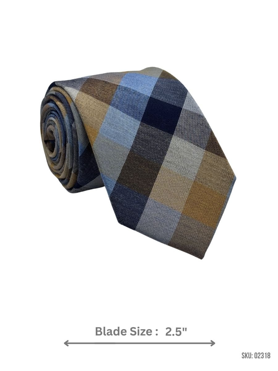 A stylish plaid tie with a blend of blue and brown, perfect for adding texture to your outfit.