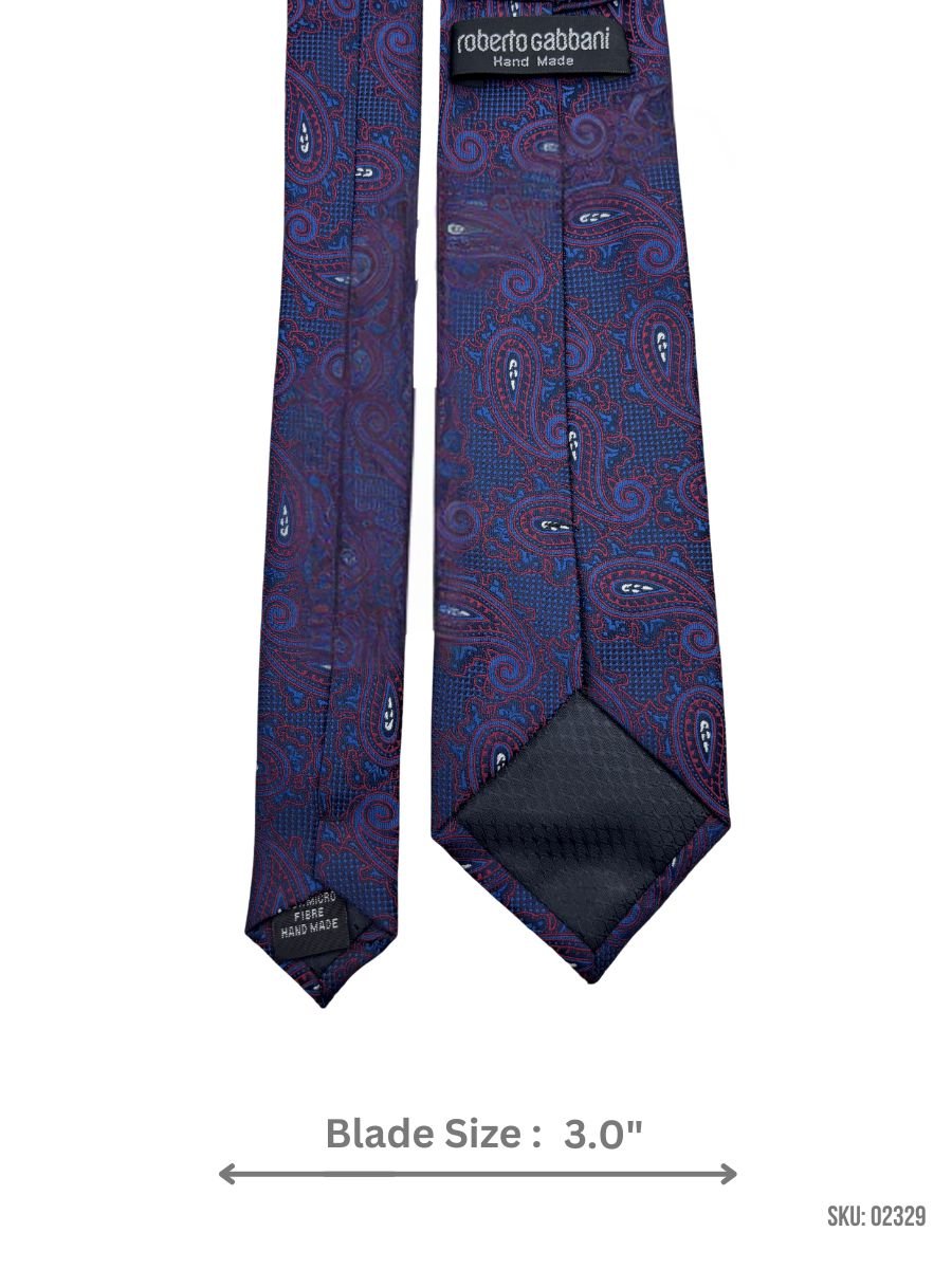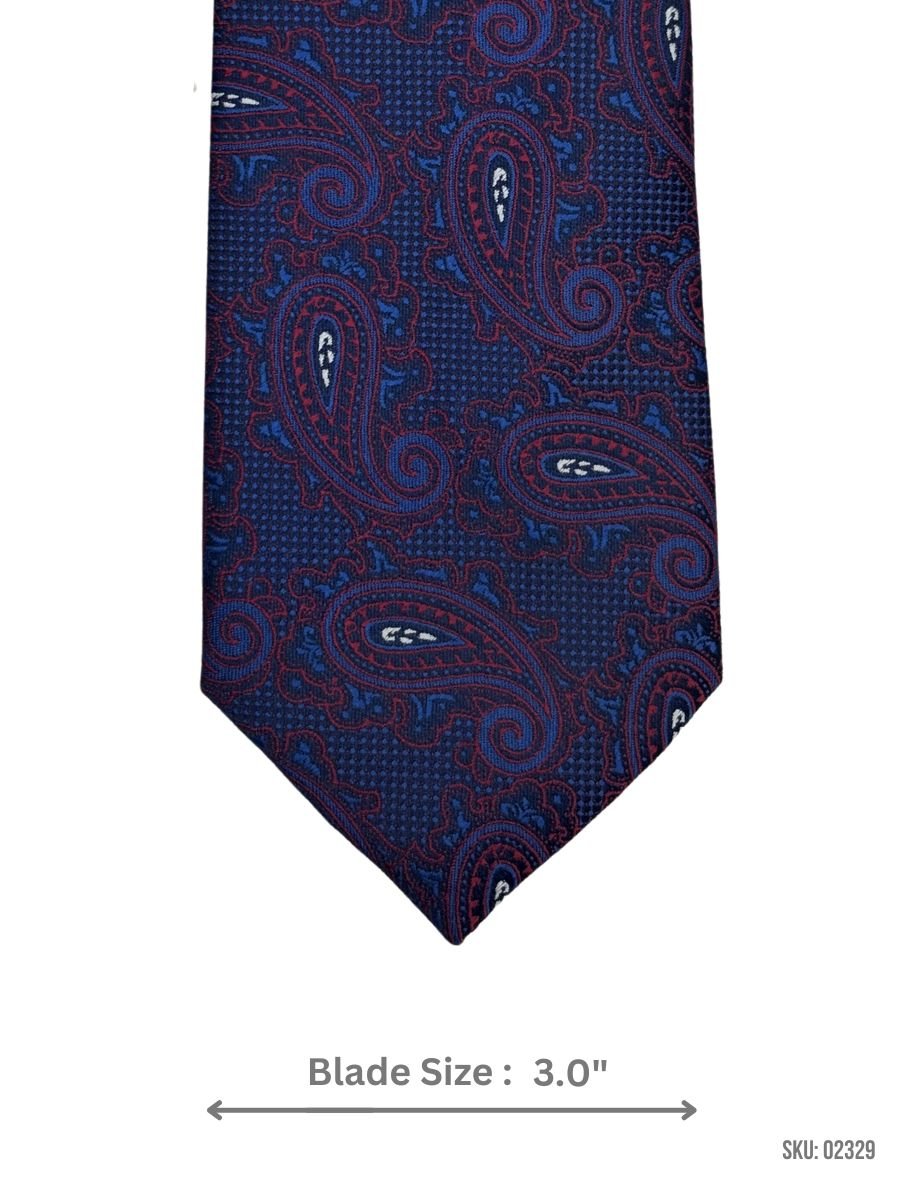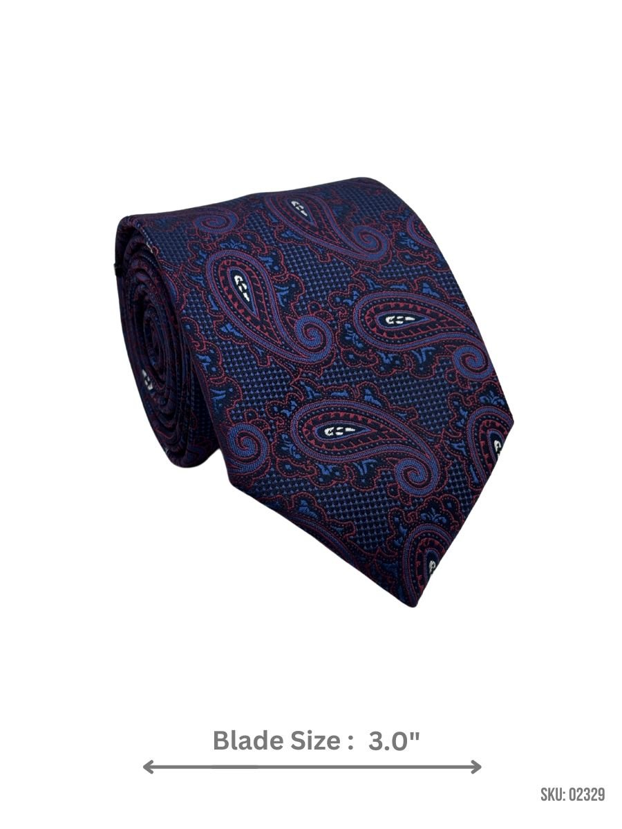 A Navy Blue Paisley Tie with Red and White Accents, perfect for adding a touch of color to your formal attire.