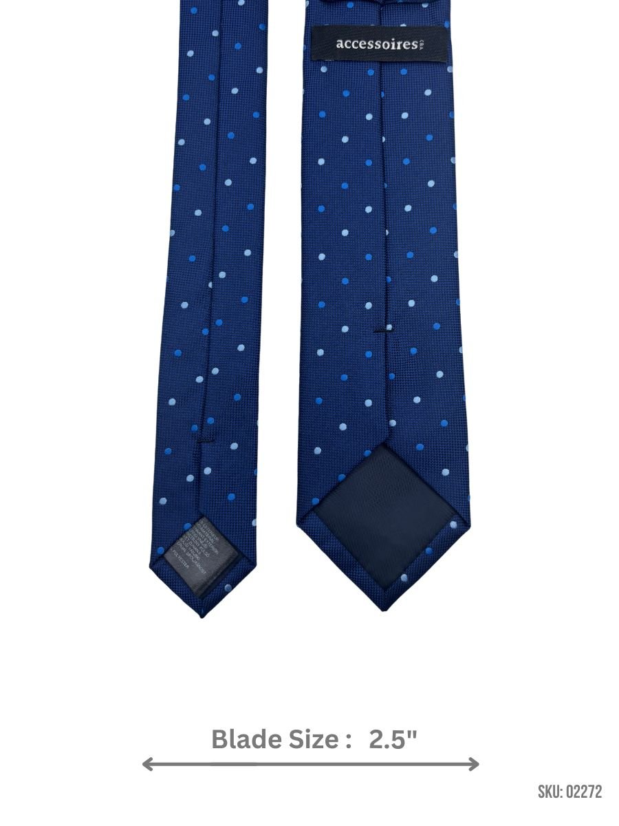 A navy blue tie with light blue polka dots, great for adding a touch of charm to business outfits.