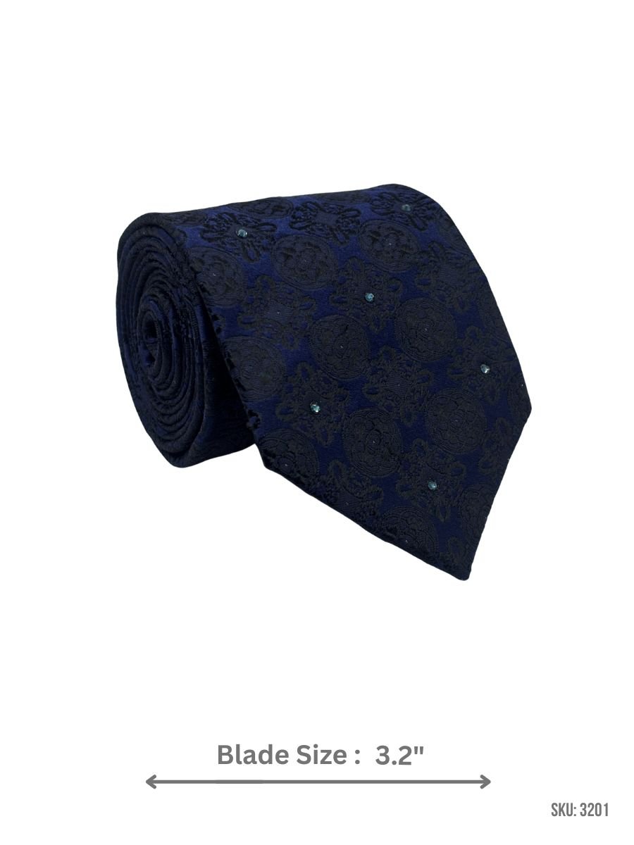 This navy blue tie features a textured black paisley floral jacquard with subtle teal dot highlights for added depth and elegance. A great choice for weddings, evening events, and polished formal suits.