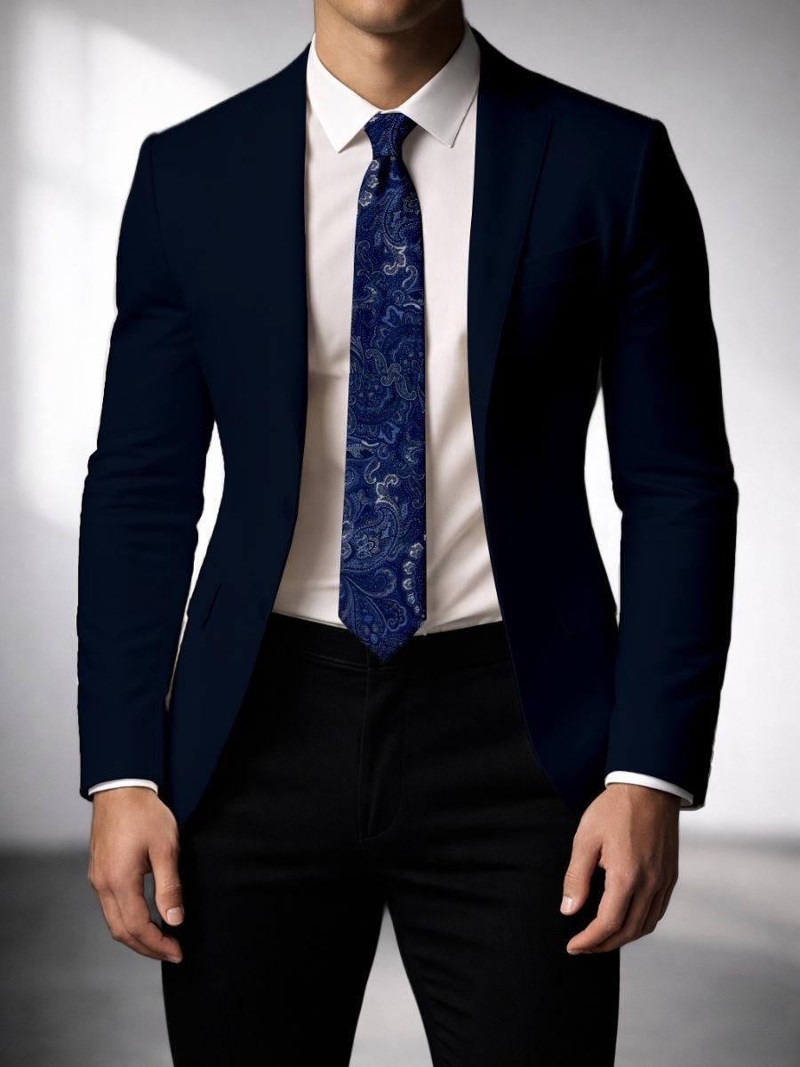 A navy blue tie featuring an intricate paisley pattern in light blue and silver tones for a premium, standout finish. Ideal for weddings, dinners, and formal suit styling with solid shirts.