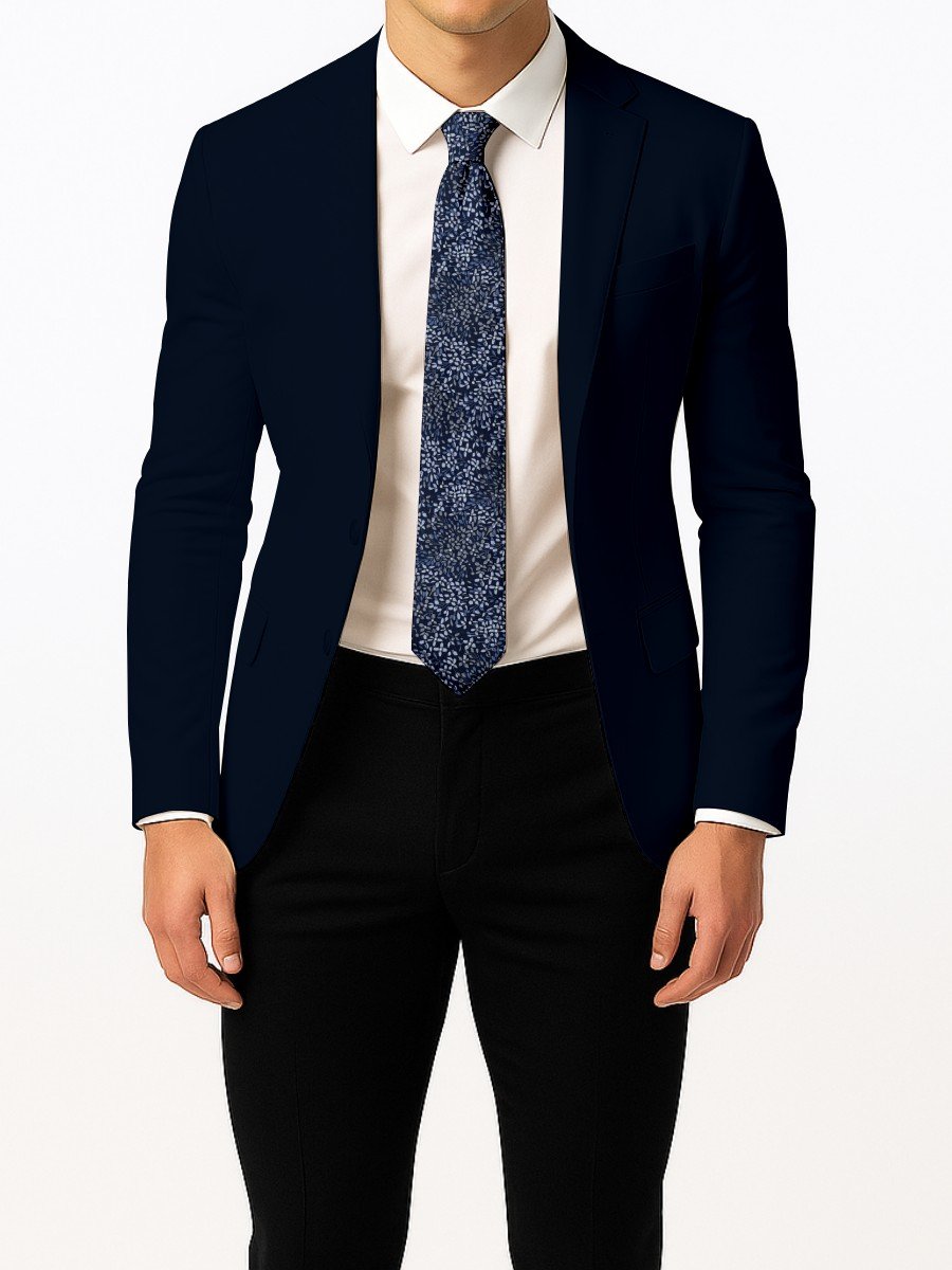 This navy floral tie features dense light blue leaf motifs that create a rich, elegant pattern with strong visual texture. A great choice for weddings, parties, and smart evening outfits—pair it with solid shirts and simple tailoring to let the print shine.