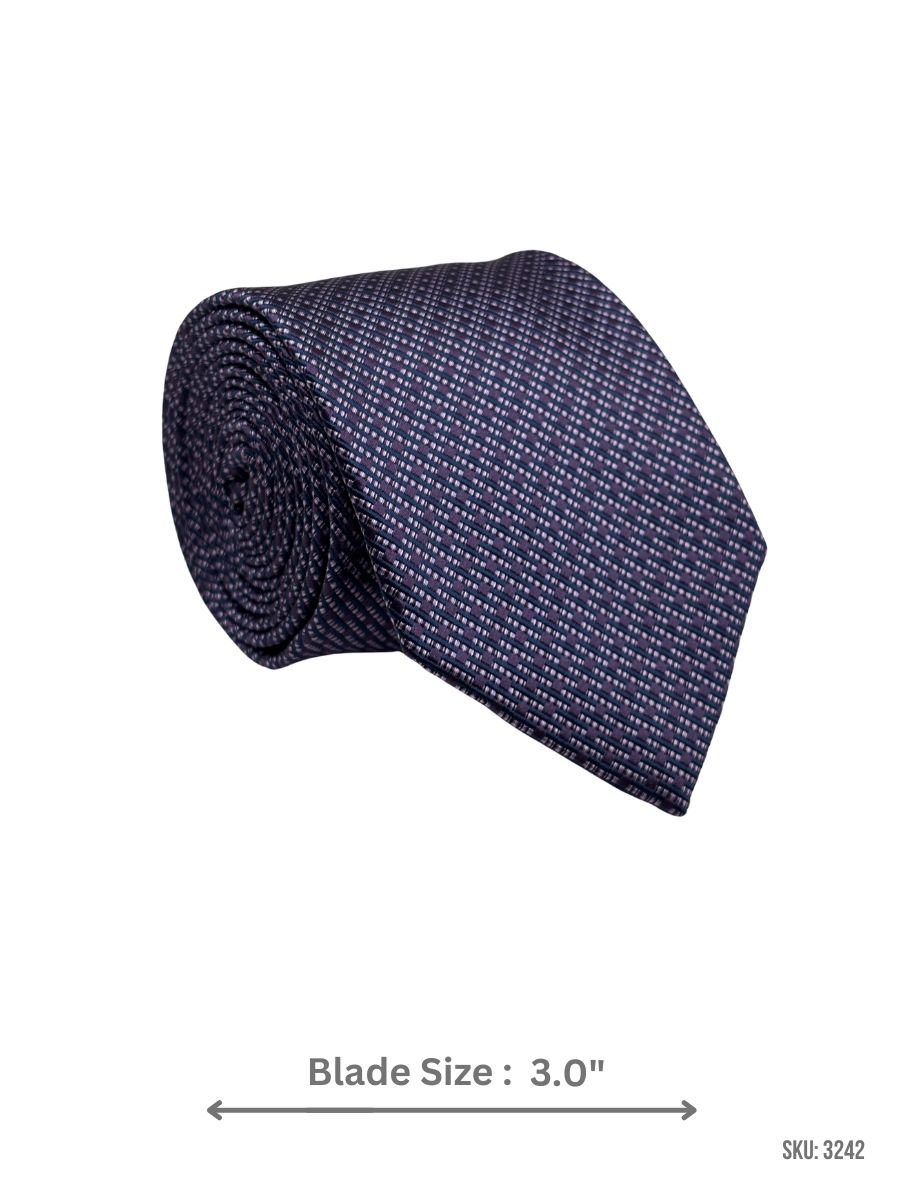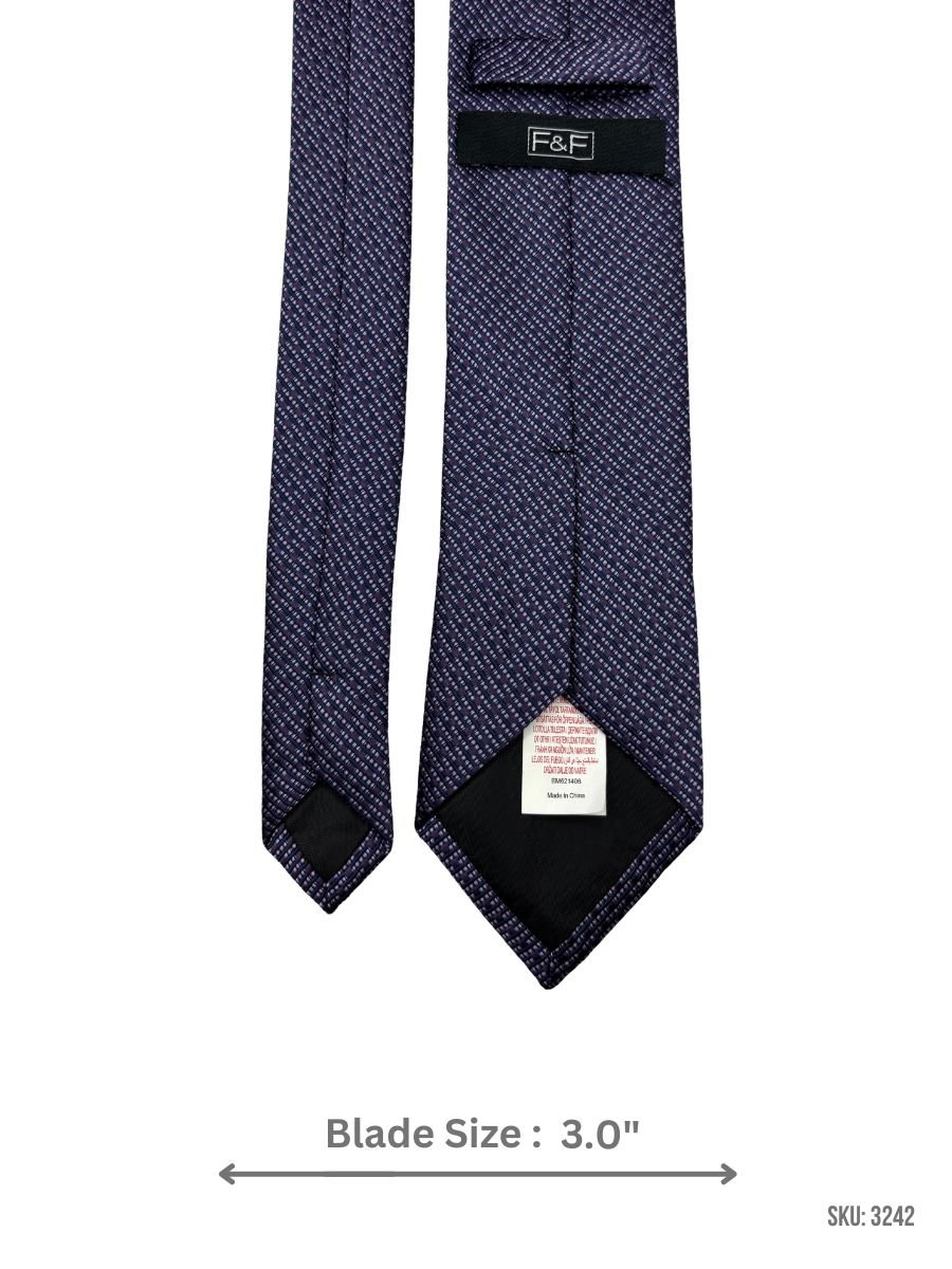 This navy blue tie features a refined diagonal layout of purple and white mini square dots for subtle contrast and a polished look. Perfect for business wear, presentations, and dress occasions with solid shirts.