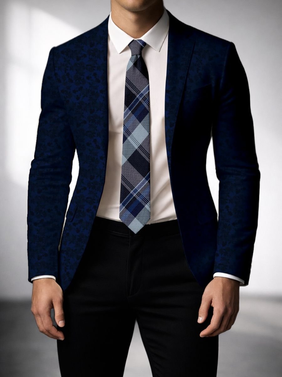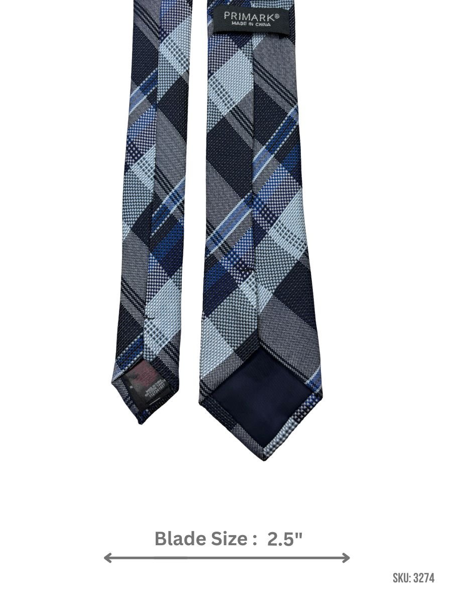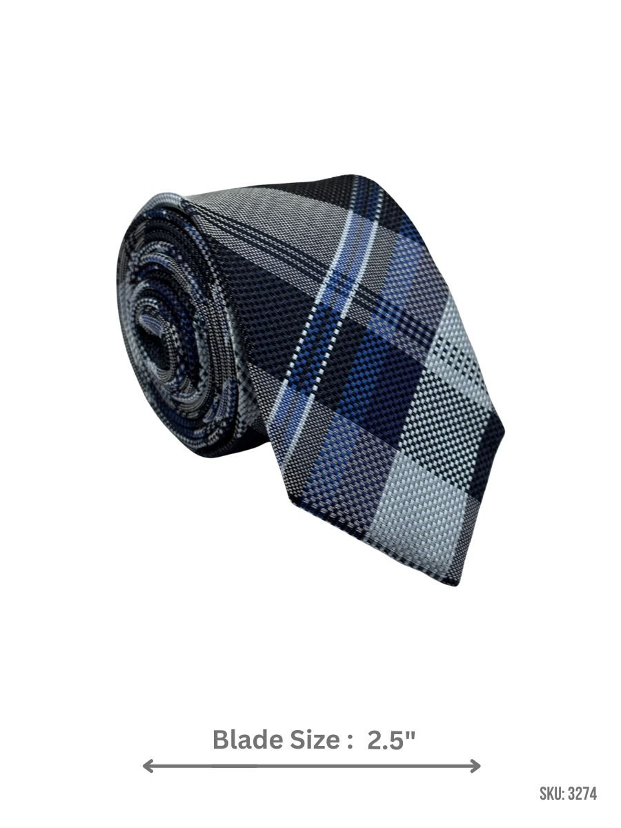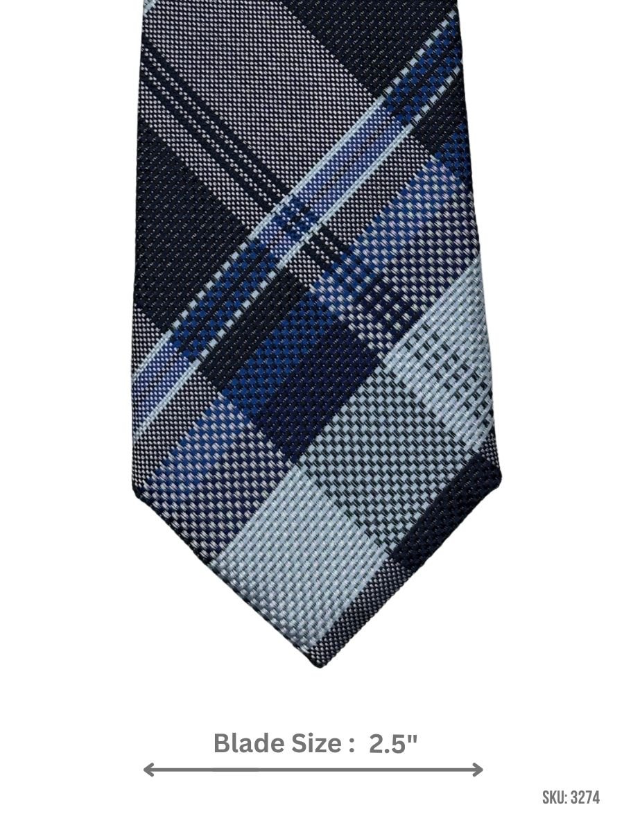 A crisp navy blue plaid-check tie featuring layered royal blue and light blue blocks with clean white and light gray lines for contrast. Easy to style with solid shirts for office wear, meetings, and formal occasions. Blade size: 2.5″.