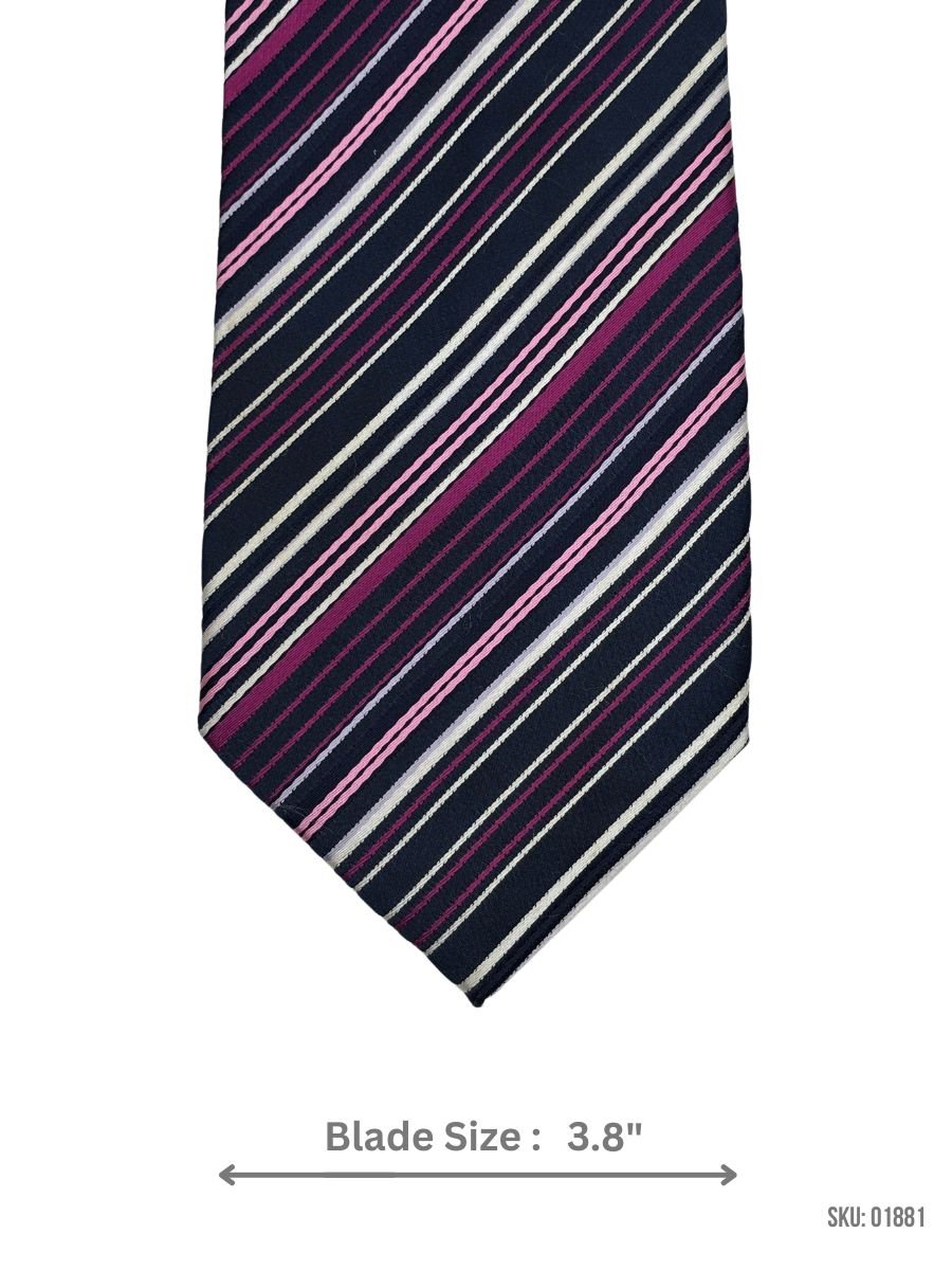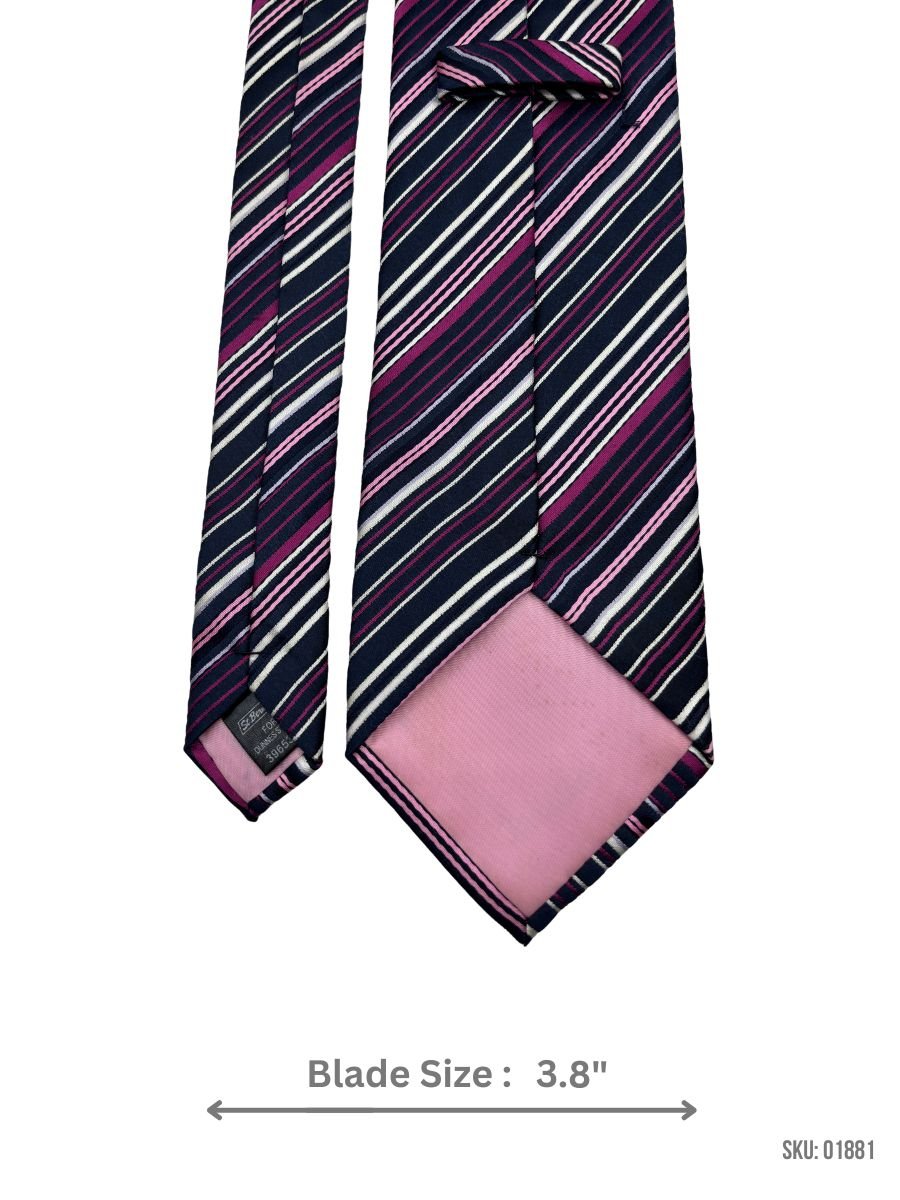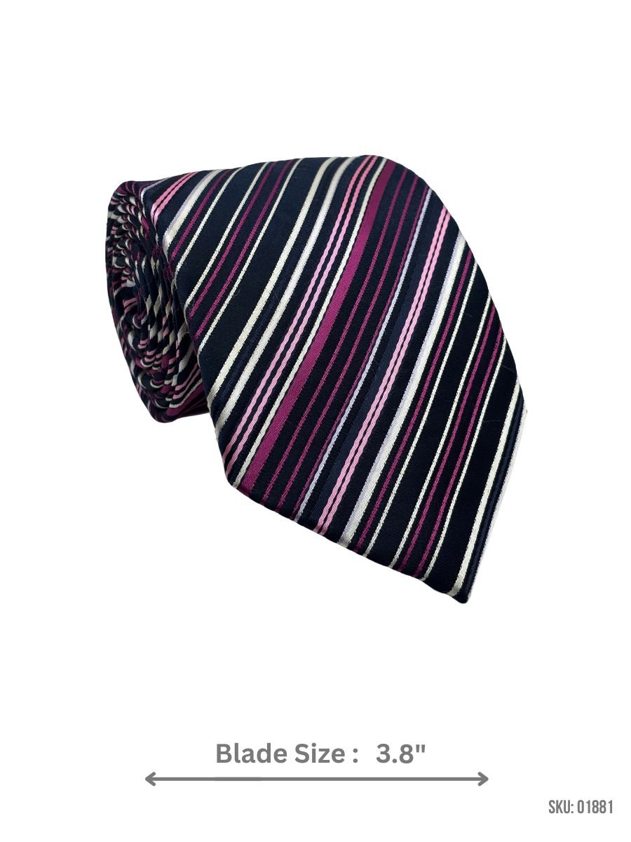 Brighten your attire with this navy blue tie, accented by striking pink and white stripes. The 3.8-inch blade adds a contemporary yet timeless edge to your look. Ideal for both professional settings and semi-formal events, this tie pairs seamlessly with navy or gray suits. Designed with premium-quality fabric, it ensures lasting comfort and impeccable style.