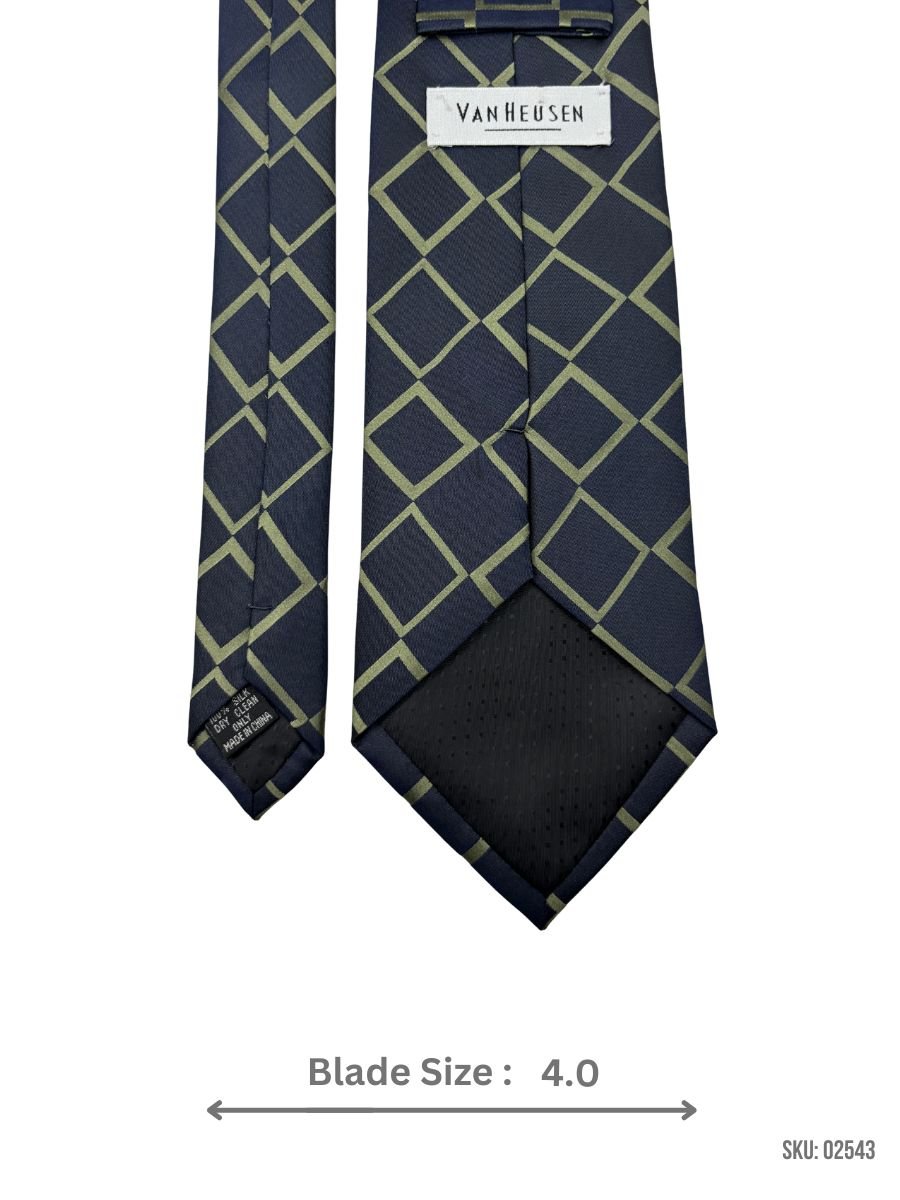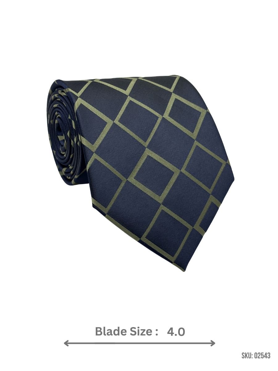 This navy blue tie features a bold gold square pattern, perfect for adding a touch of modern elegance to formal occasions. Its unique design makes it an ideal choice for both professional and semi-formal events.
