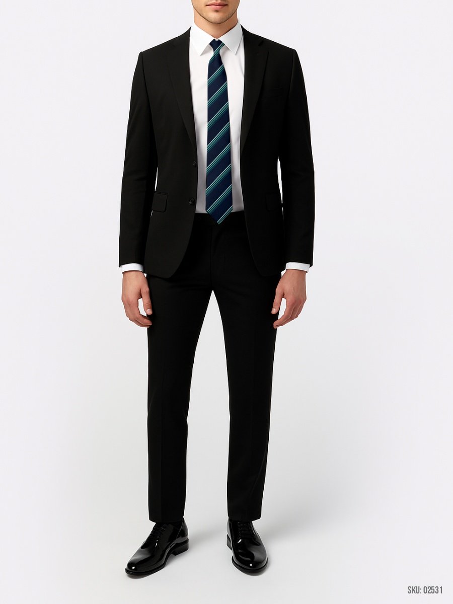 This navy blue tie with contrasting green stripes creates a striking look. The combination is perfect for those who want to add a bold yet elegant touch to their outfit.