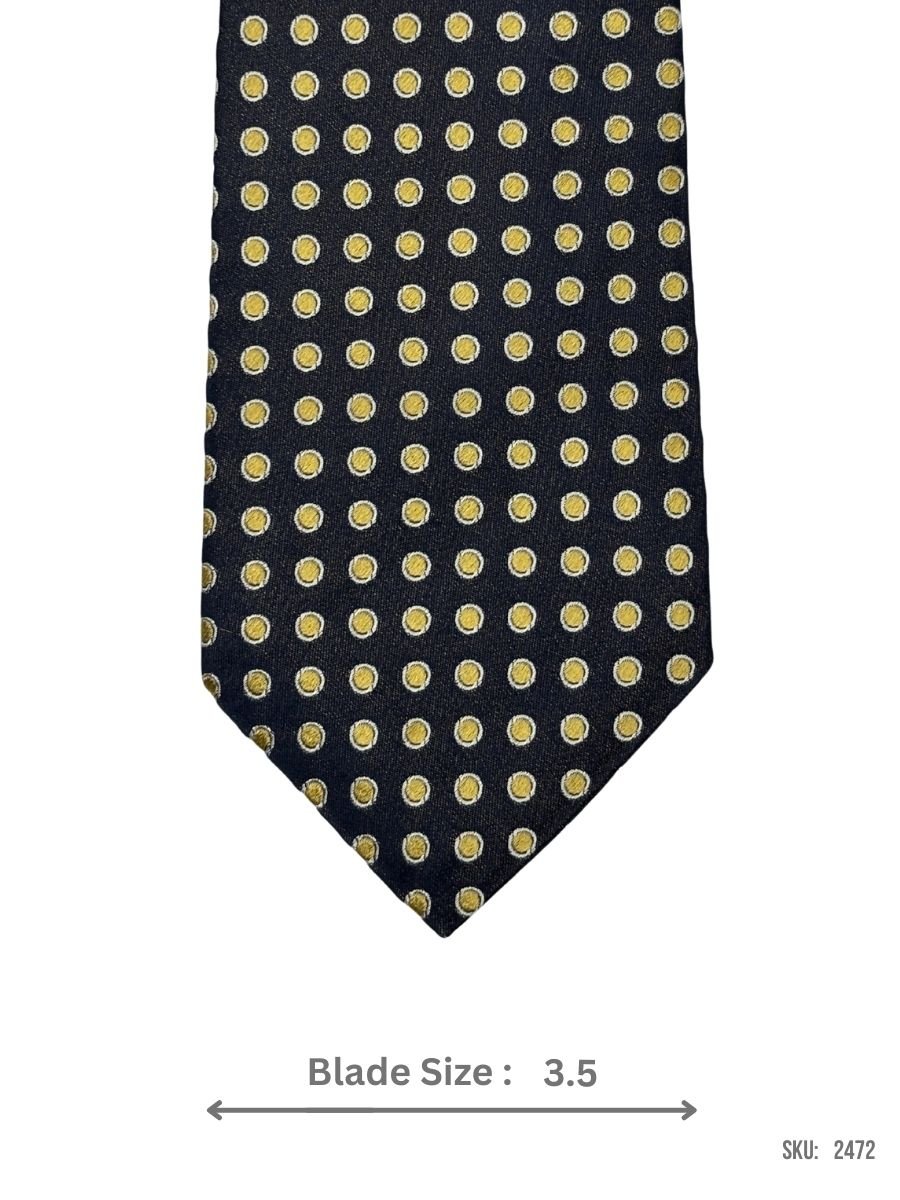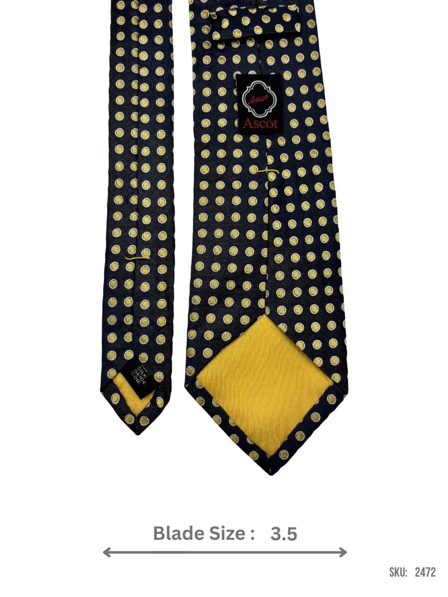 This navy blue tie features a striking yellow polka dot pattern, perfect for adding a playful touch to your formal outfit. The bold color contrast makes it a statement accessory for any wardrobe.