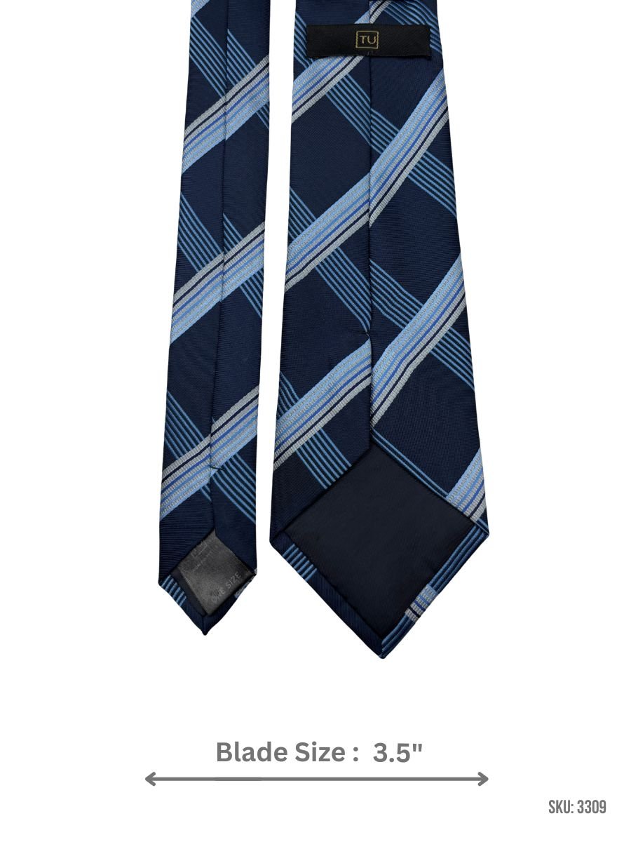 A polished navy tie featuring sky blue and silver cross stripes for a smart and contemporary formal look. Ideal for office wear, meetings, and special occasions.