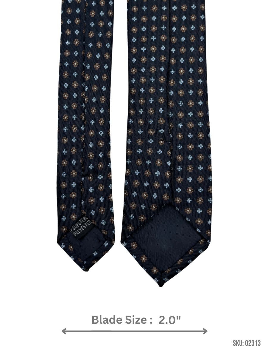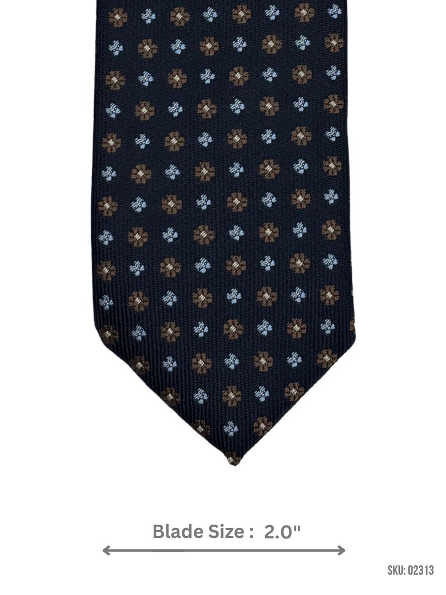 This navy tie features a charming floral pattern in shades of brown and blue. The intricate design adds a subtle touch of sophistication to your ensemble, making it perfect for any formal event or business meeting. Its versatile color and pattern make it suitable for a wide range of outfits and occasions.