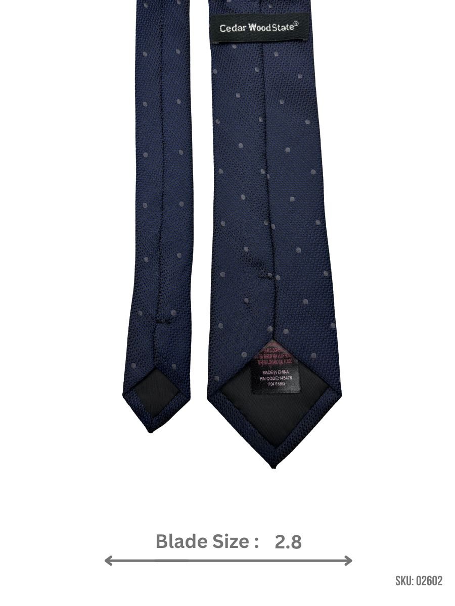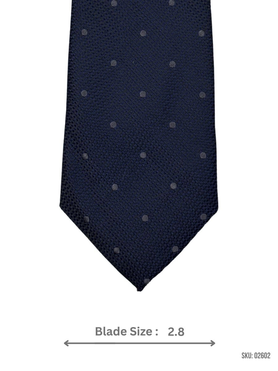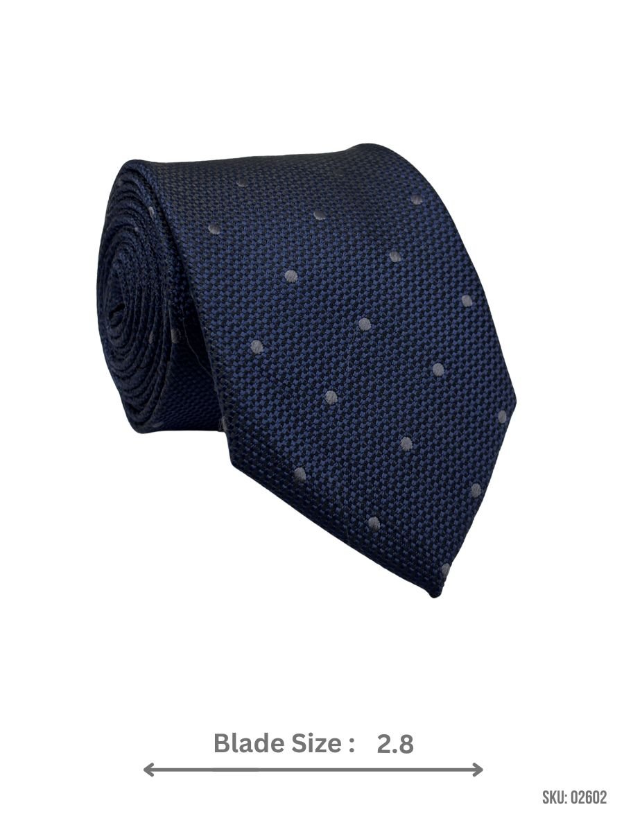 A classic navy tie with subtle polka dots, ideal for a stylish and contemporary look.