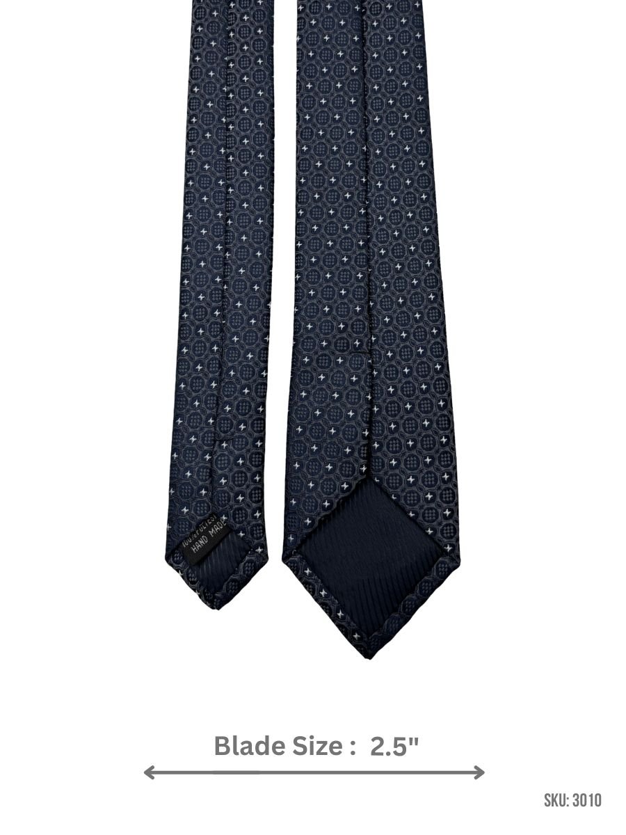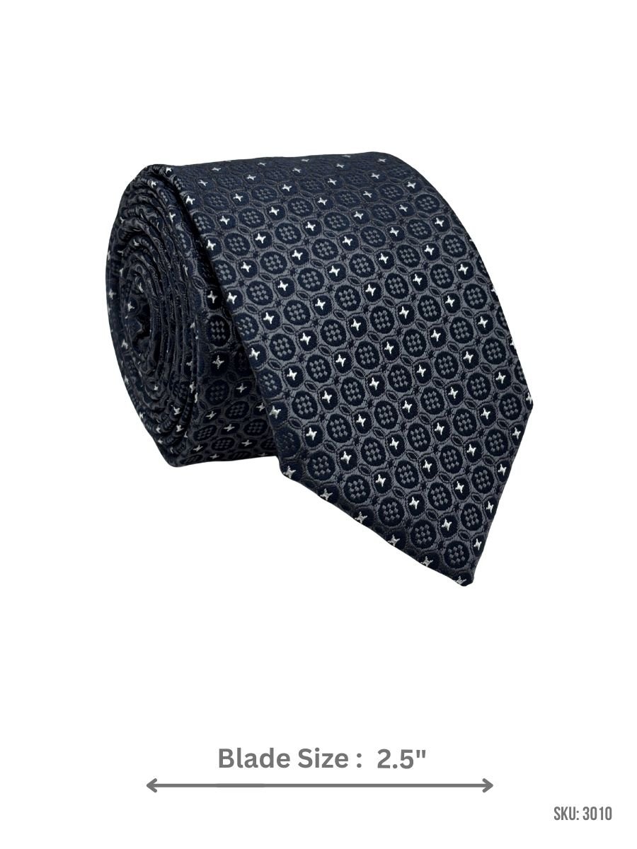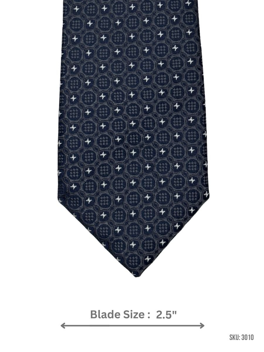 This navy tie combines repeating grey medallion circles with crisp white pinwheel-style motifs for a timeless, dress-ready design. The balanced contrast keeps it professional and easy to match, making it ideal for office wear, dinners, and formal occasions—especially with solid shirts in white, light blue, or grey.
