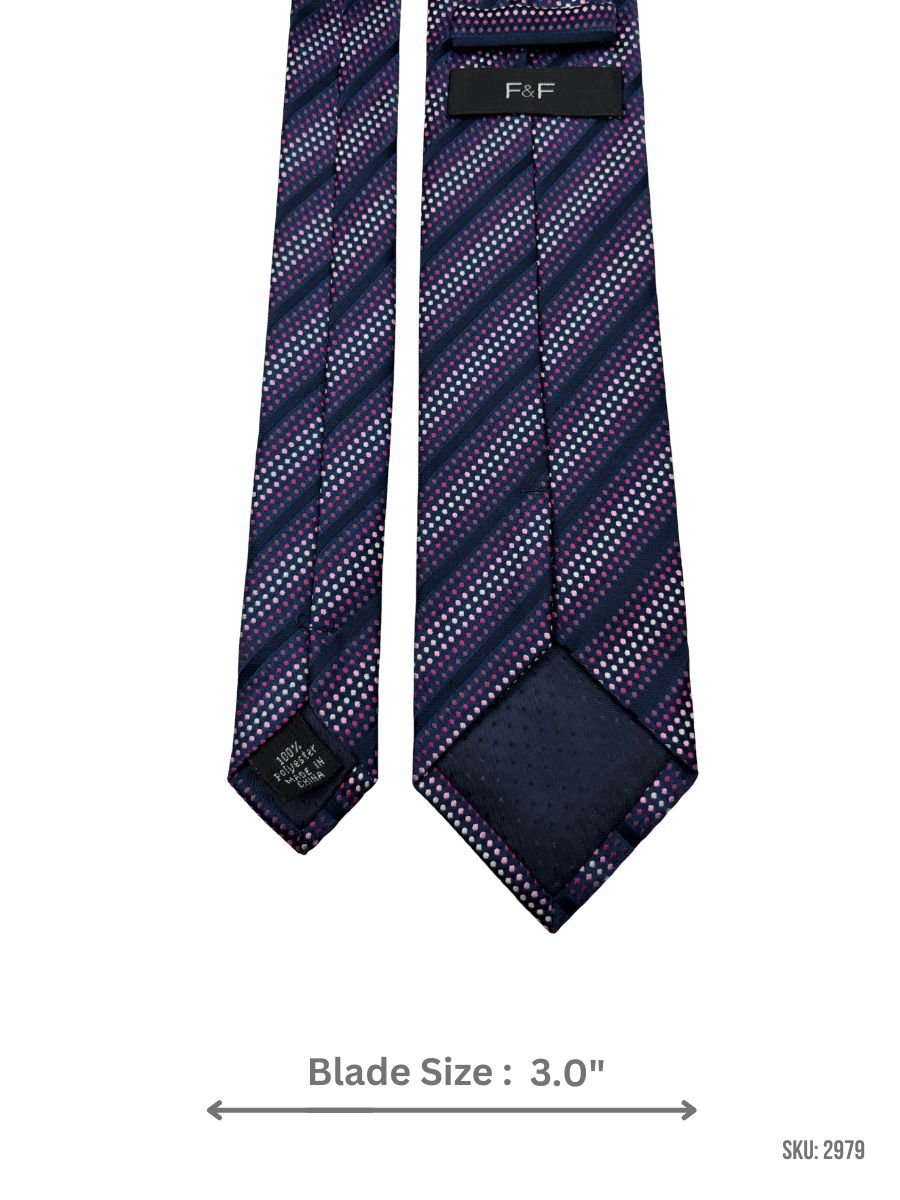 This navy tie combines deep navy diagonal bands with patterned stripe sections made of pink and white polka dots, giving it a confident, standout style. Perfect for weddings, parties, and statement formalwear, it pairs best with solid shirts to let the pattern shine.