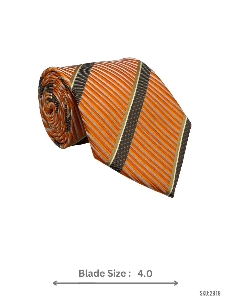 This orange striped tie delivers strong color with balanced neutral accents, creating a standout yet refined accessory.