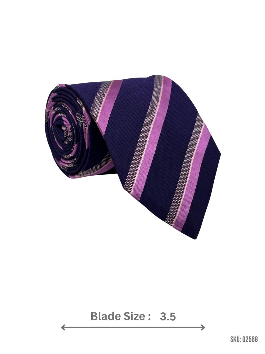Elevate your look with this purple and navy striped tie, featuring clean white accents for extra sharpness. Ideal for adding a stylish yet professional edge to your wardrobe.