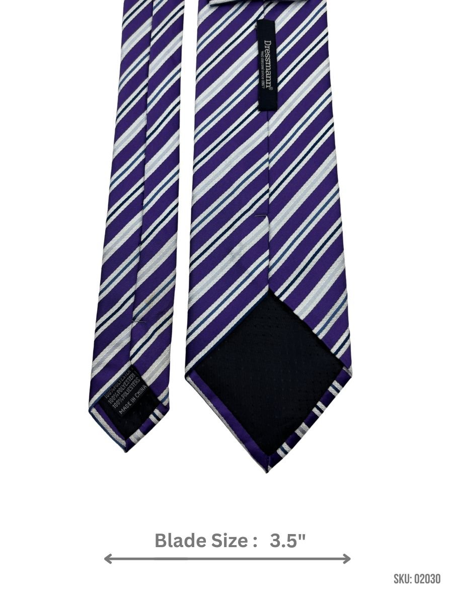 A vibrant purple tie with silver diagonal stripes for a striking look.