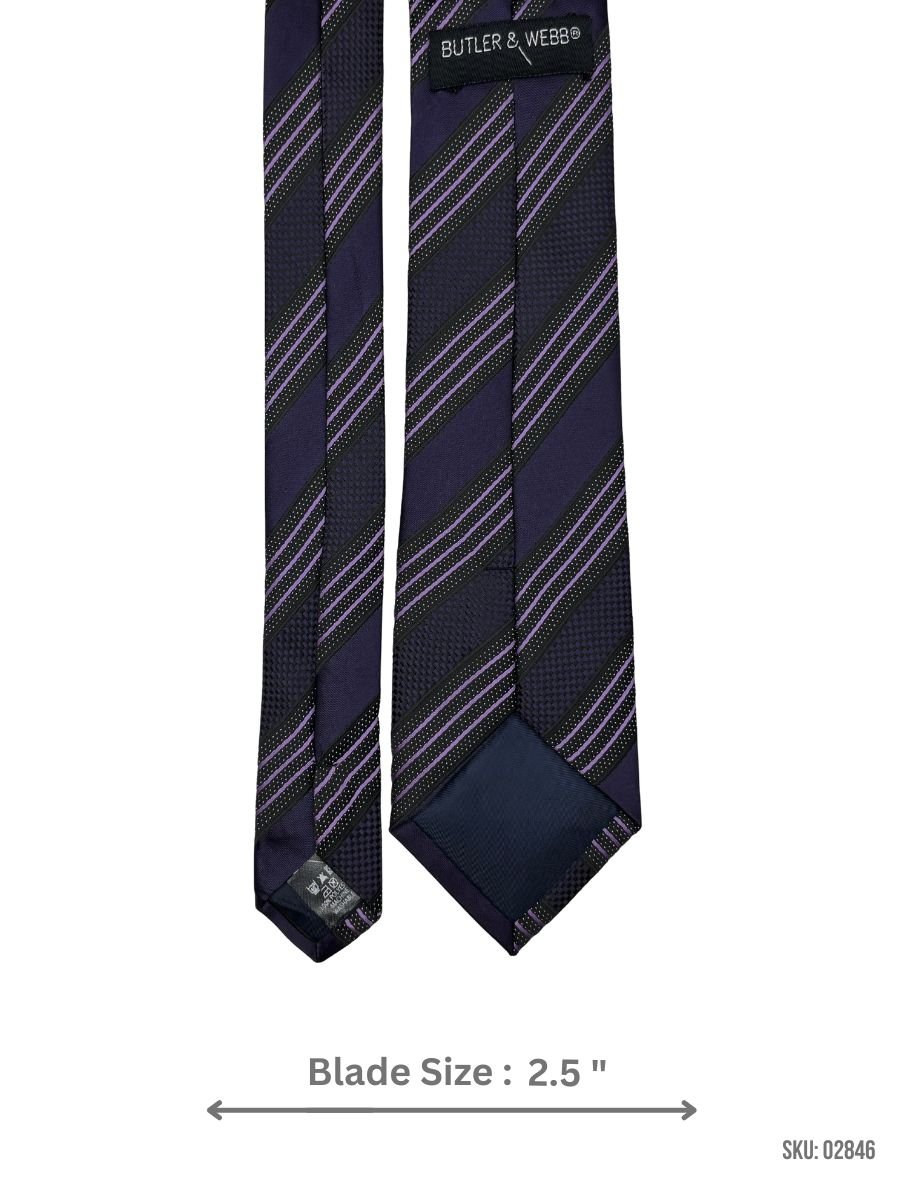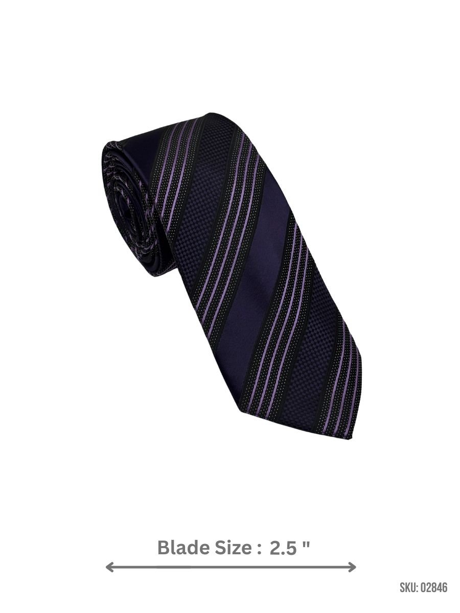 A purple tie designed with layered purple and black diagonal stripe detailing.