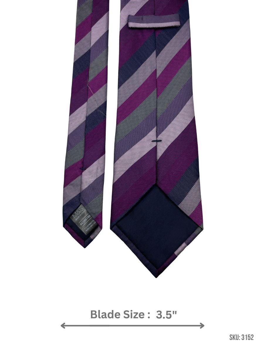 A rich purple tie designed with wide diagonal striping in navy blue, lavender, and charcoal gray tones for a balanced, elegant statement. Ideal for formal occasions, parties, and polished suit styling.