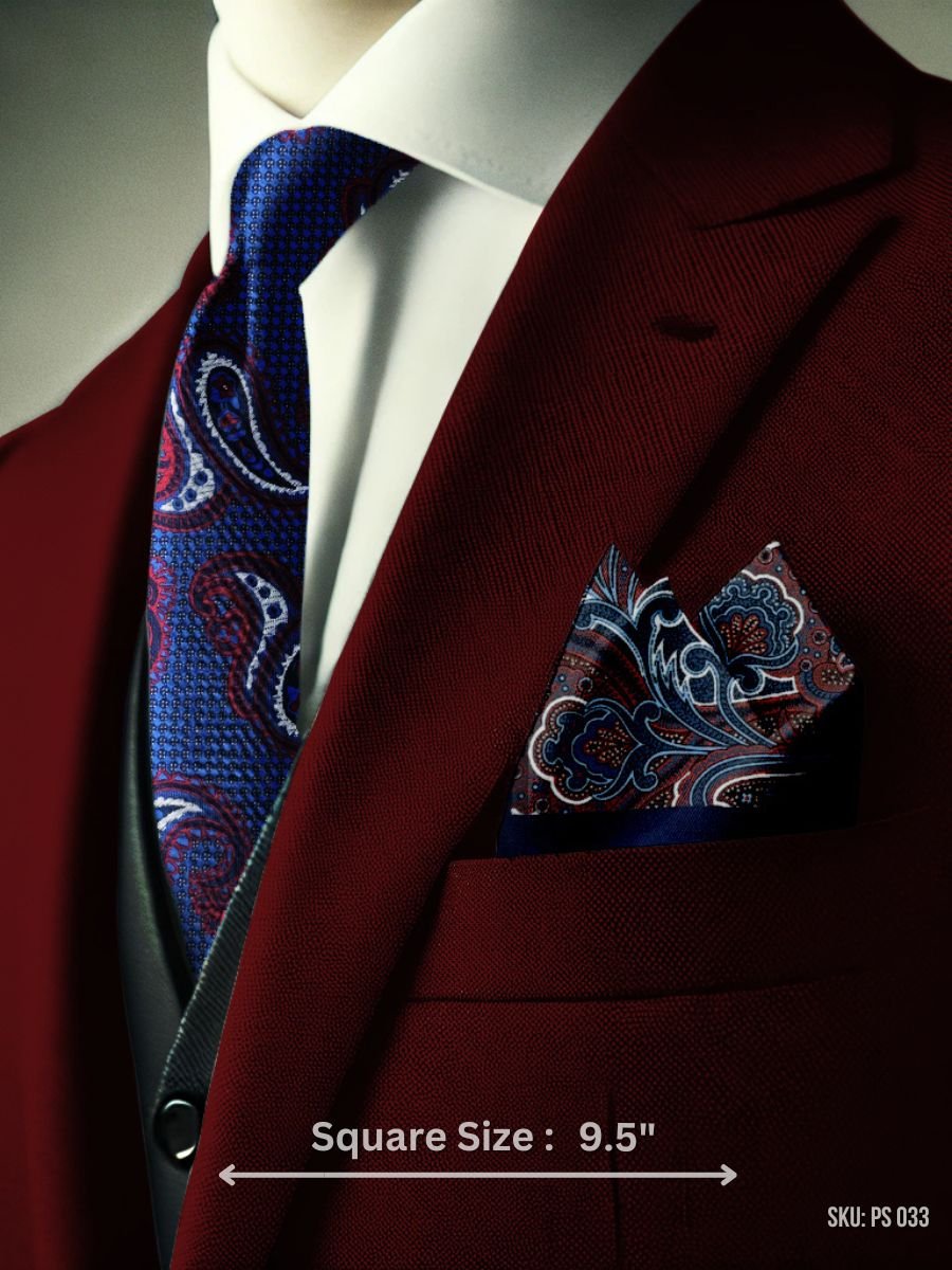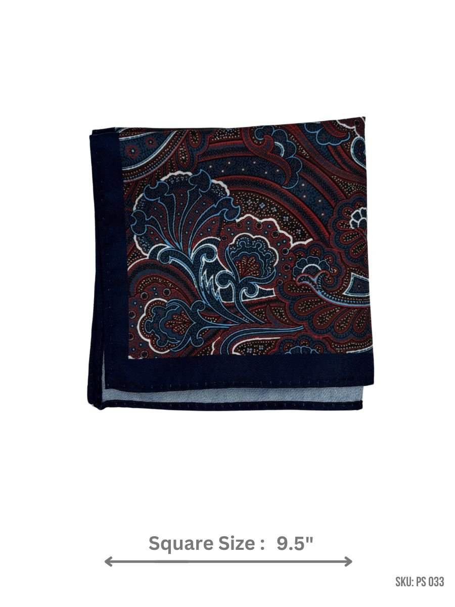 Add elegance to your outfit with this paisley pocket square featuring a sophisticated blend of navy blue and red, accented with light blue and white details. With a 9.5″ square size, it’s perfect for both formal and semi-formal events.