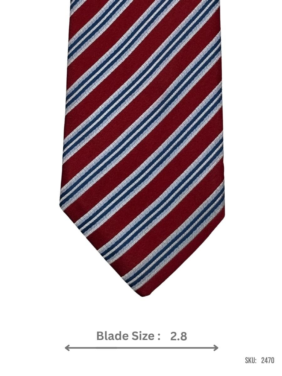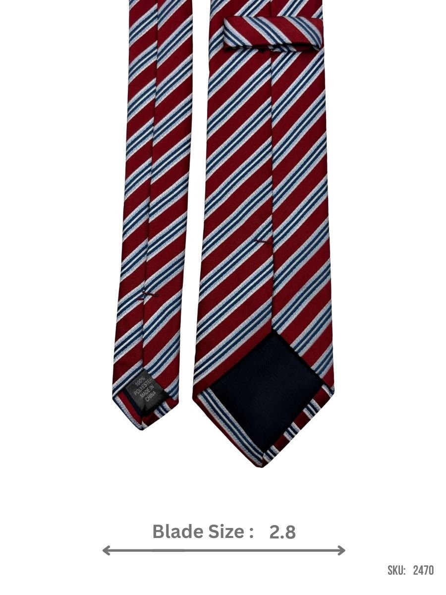 Stand out with this red tie featuring sharp blue and white stripes. The strong color contrast makes a bold statement while still maintaining a professional aesthetic, making it perfect for business meetings, interviews, or any event that calls for a stylish yet formal accessory.