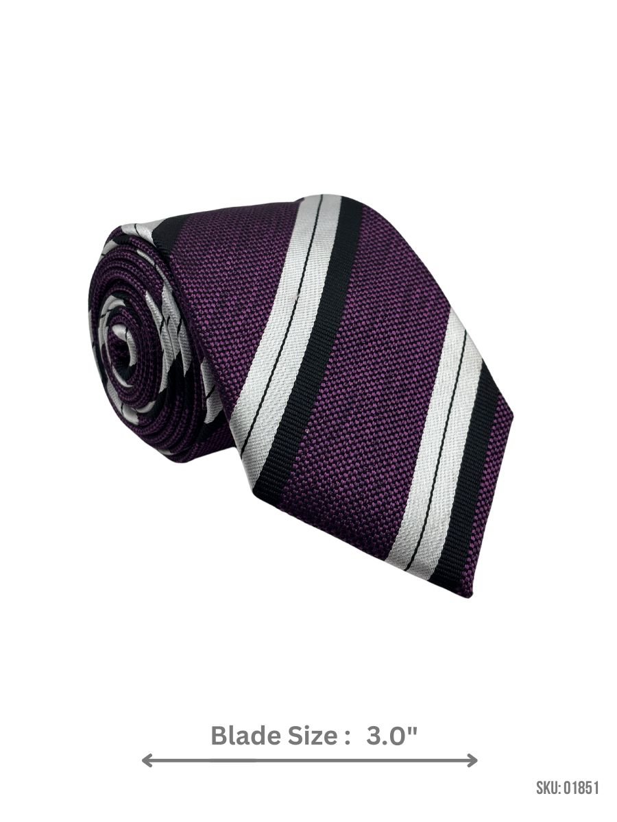 Upgrade your style with this refined purple tie, featuring clean white and black stripes along a 3.0-inch blade. A versatile choice for both professional and special events.