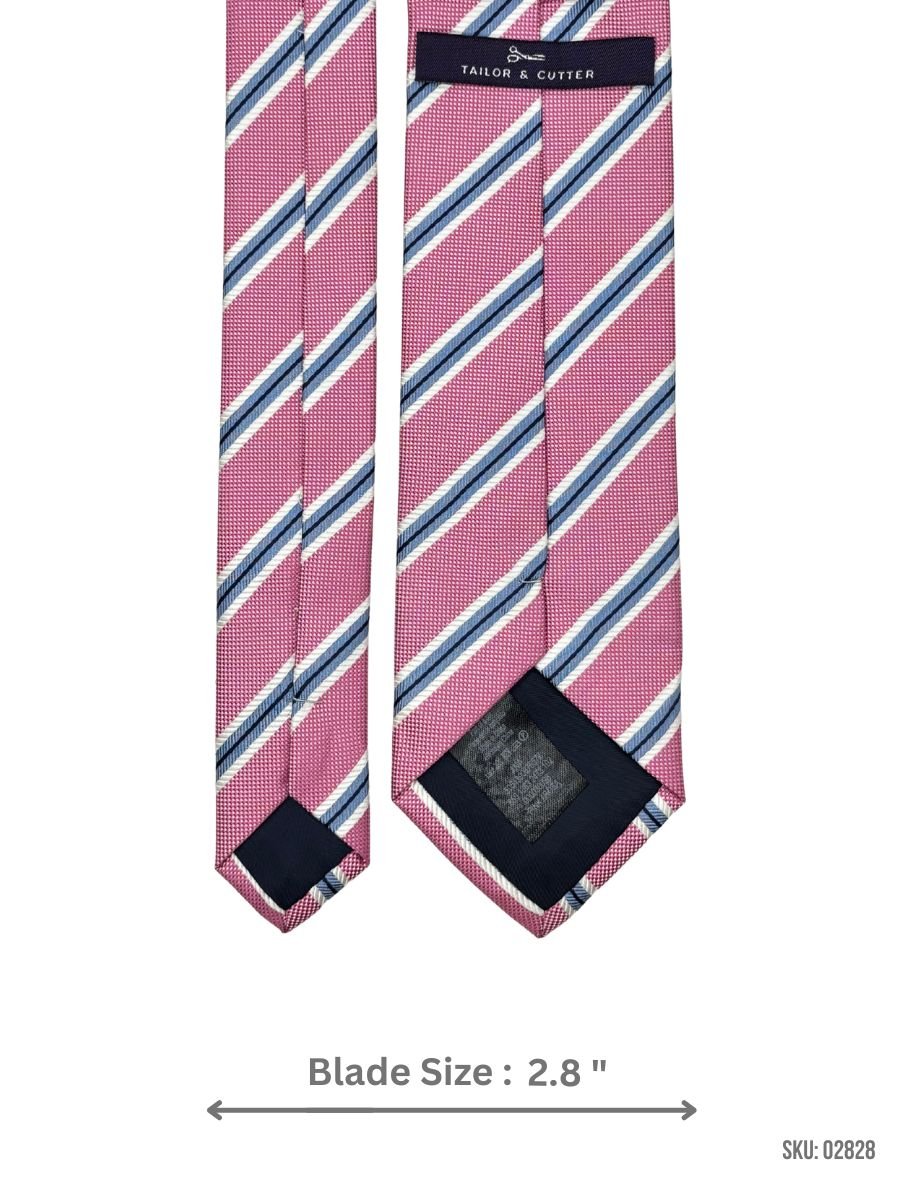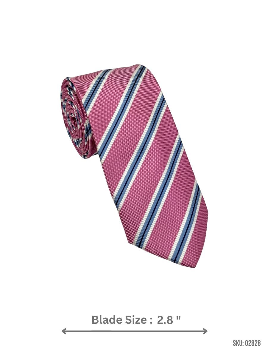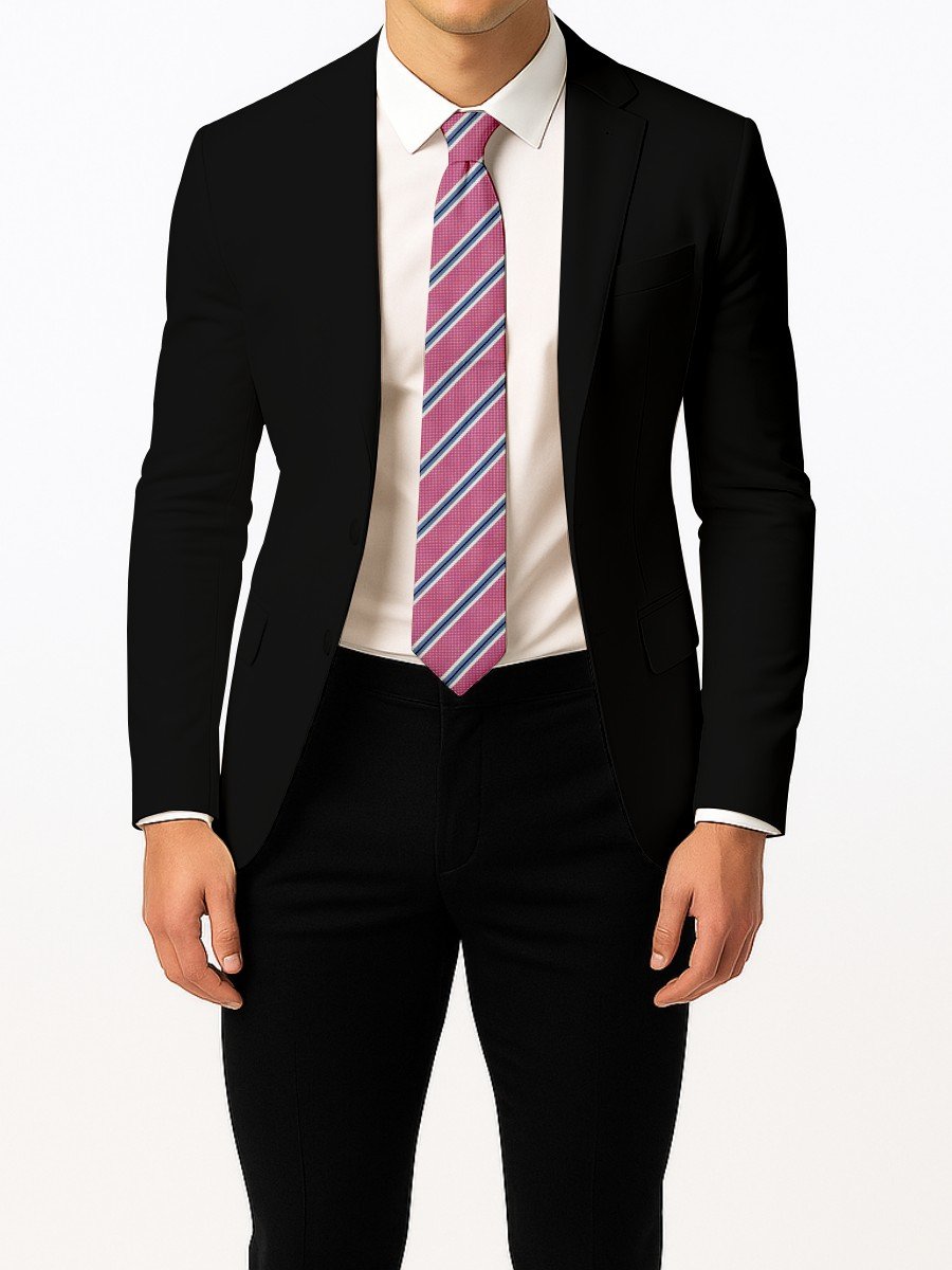 This rose pink tie combines a textured weave with contrasting diagonal stripes in navy and white. The balanced color combination delivers a polished yet contemporary style ideal for business and formal use.