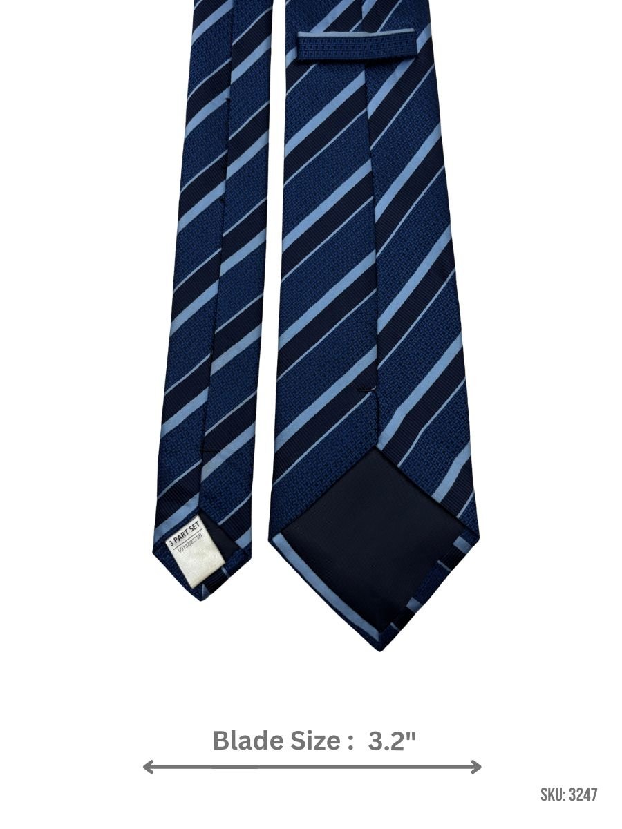 A classic Royal blue striped tie with light blue and Navy Blue diagonal bands, accented with clean white striping for a polished look. Great for workwear, presentations, and formal occasions.