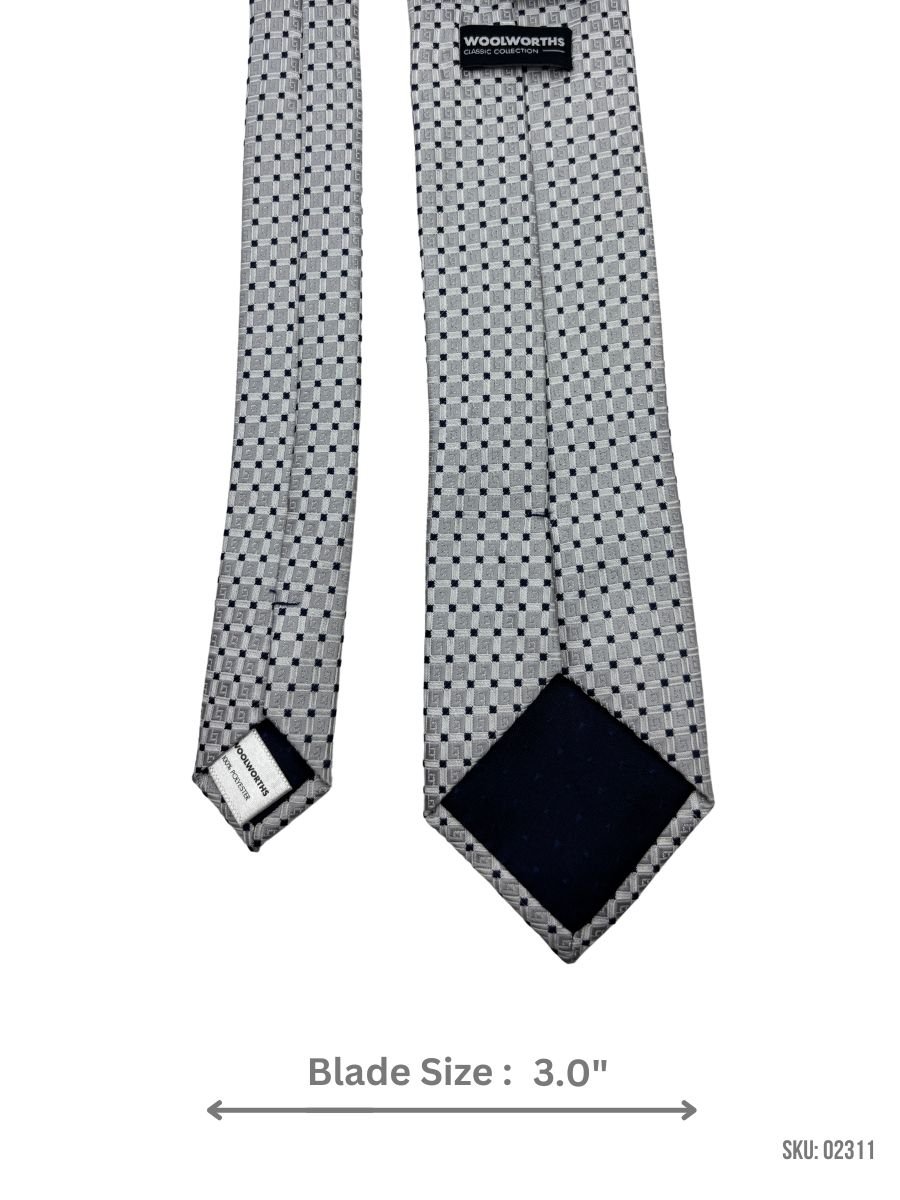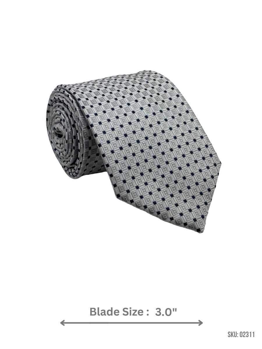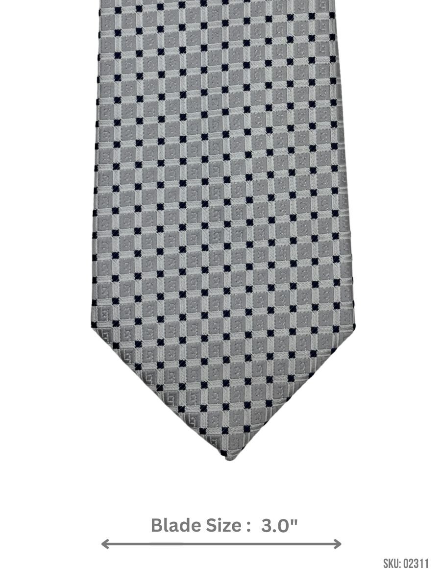 A stylish silver tie with a navy geometric pattern, offering a modern and elegant appearance.