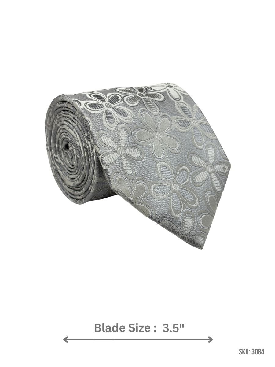 Elevate your outfit with this silver tie featuring elegant floral motifs. Ideal for weddings, parties, and formal occasions.