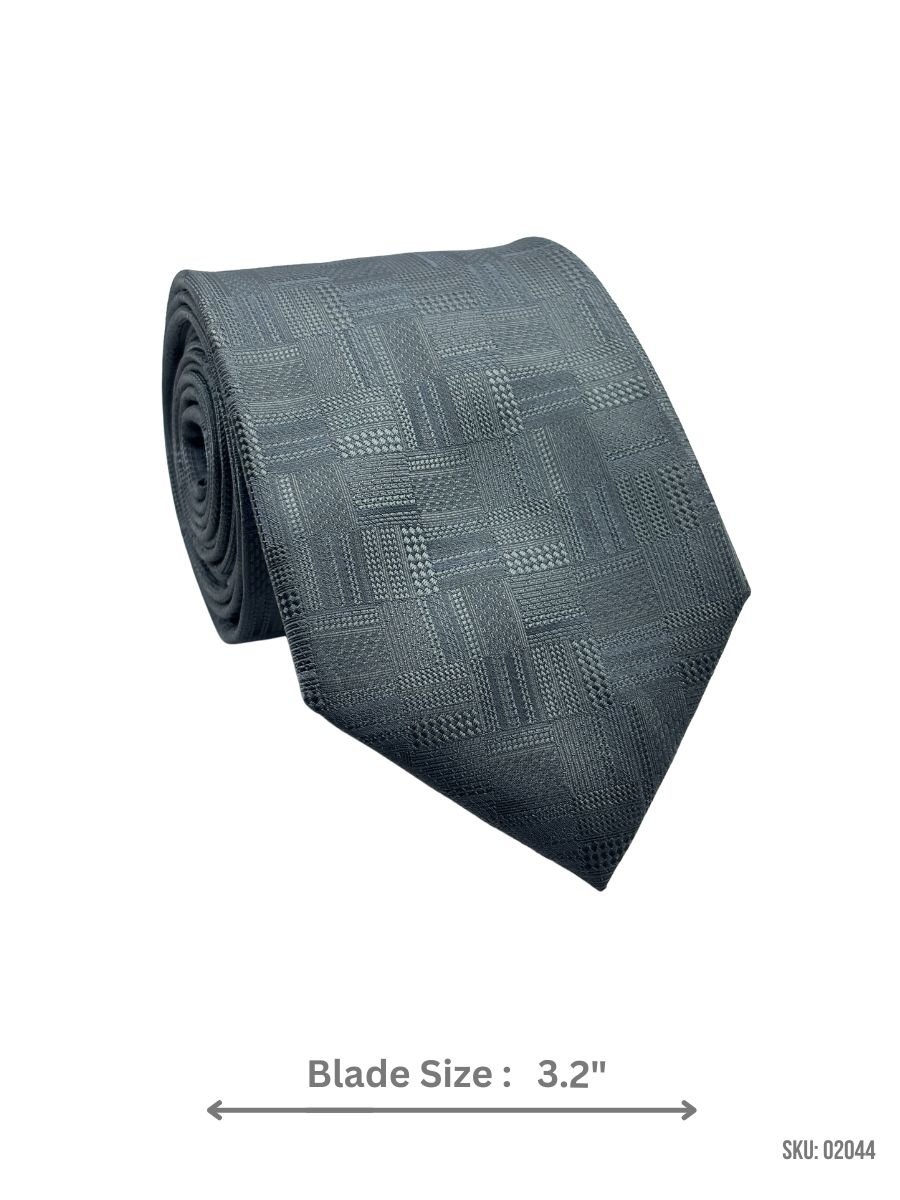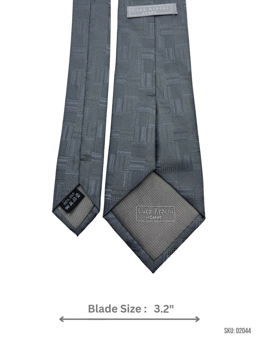 Enhance your formal attire with this elegant gray tie, featuring a refined checkered texture. The 3.2-inch blade ensures a sleek and modern silhouette, suitable for professional settings and special occasions. This tie pairs seamlessly with dark and light shirts, offering timeless appeal.